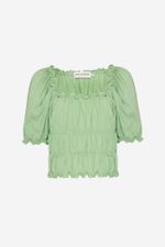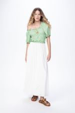 O top Clementine CRIS BARROS é fresh e romântico. De Jaipur, tecido misto de fibras naturais com caimento leve e fluido. Possui decote reto, corpo franzido com marcações de elásticos, mangas bufantes com volume e elástico nos ombros e nas barras.