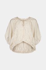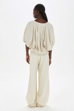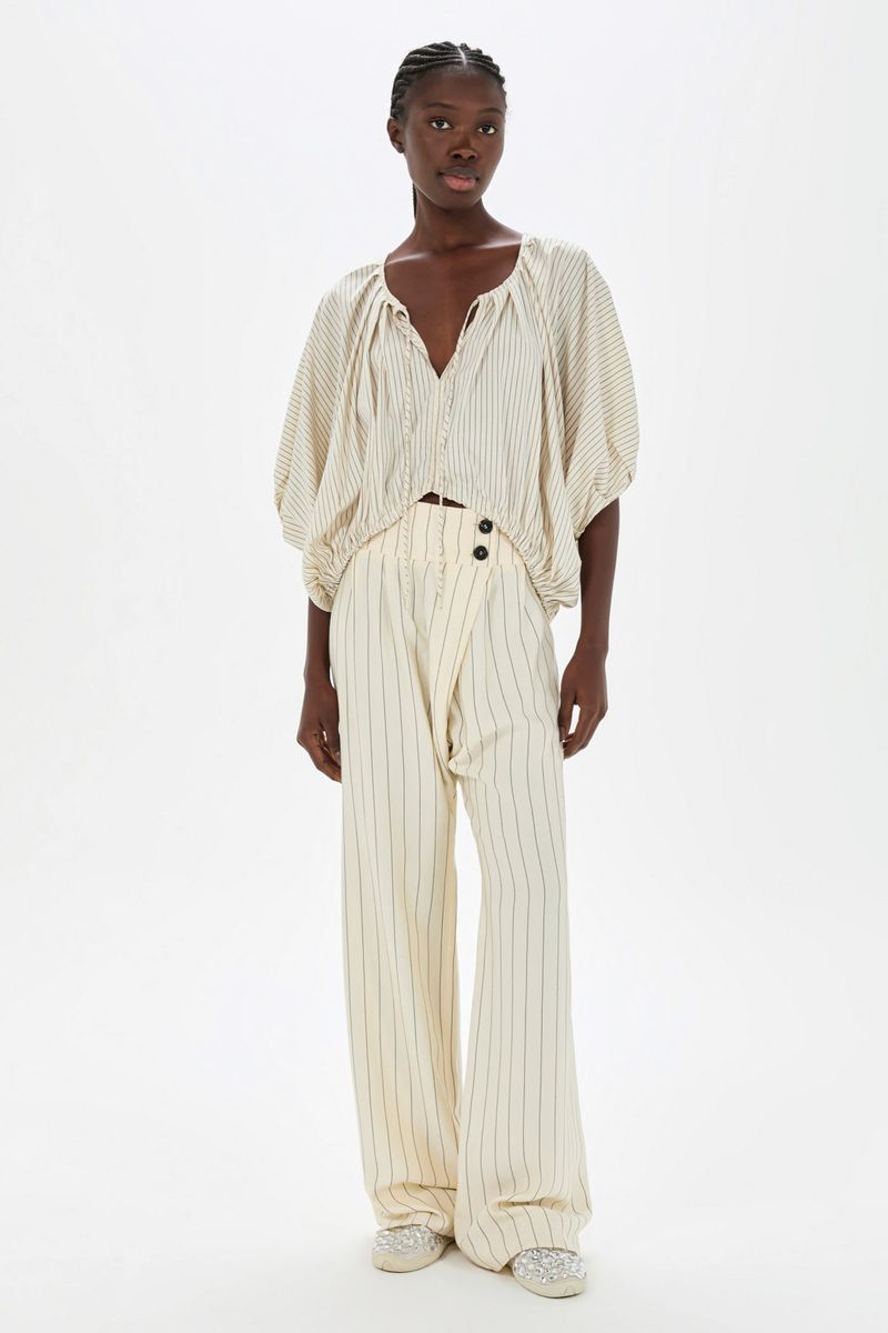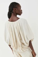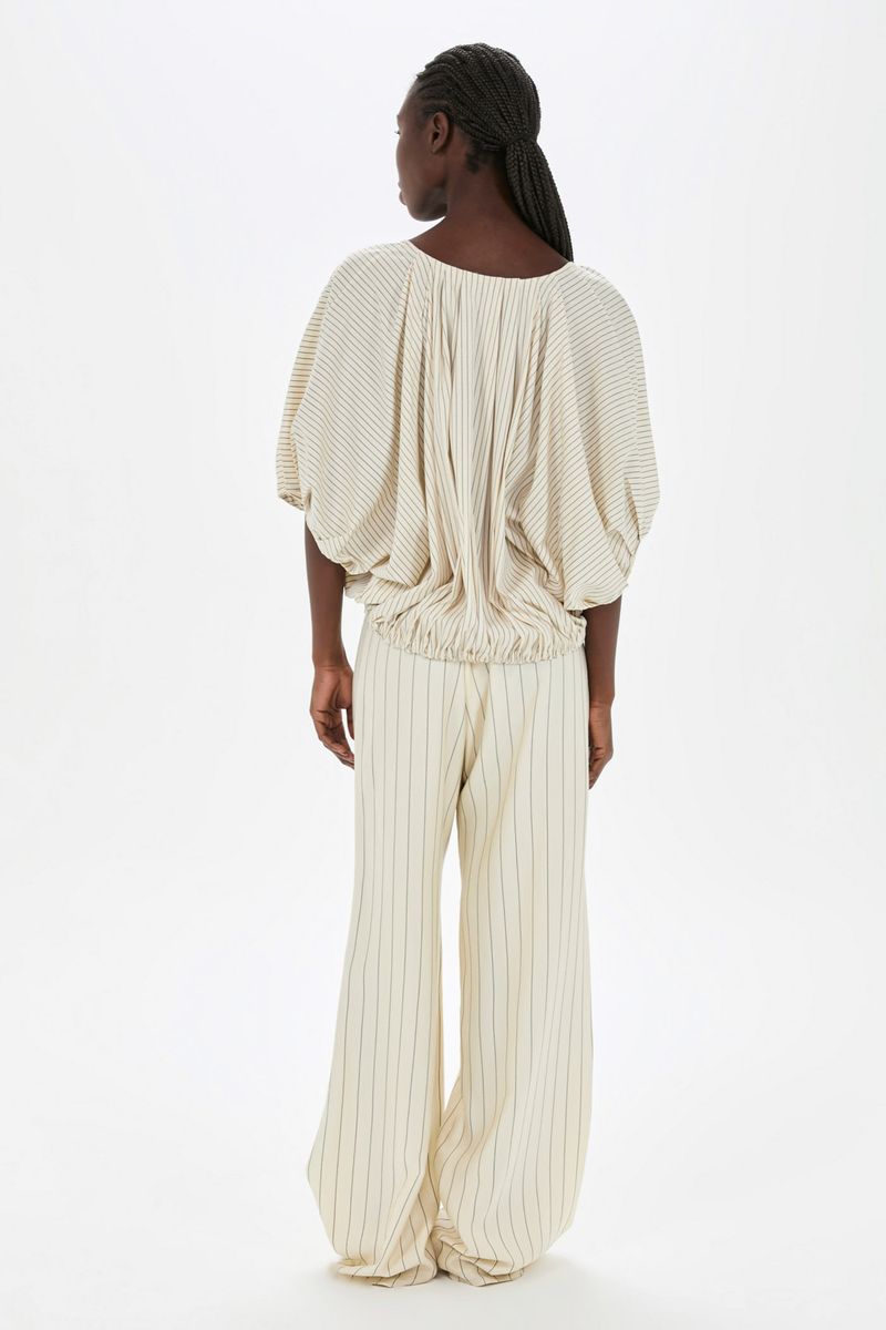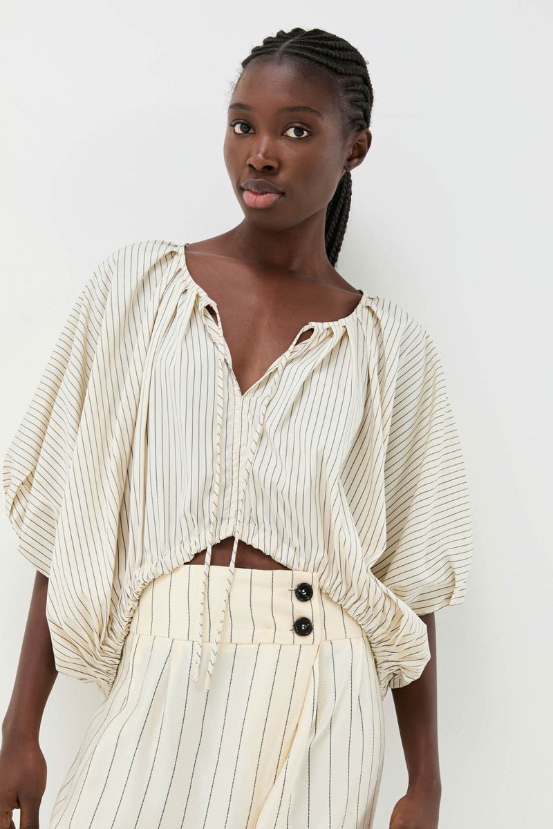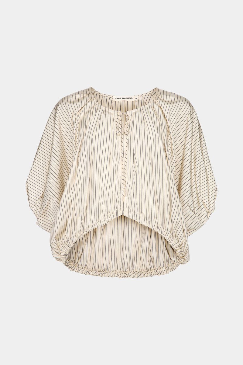 O top Cusco CRIS BARROS é cool e descolado. De Eugênia listrado, tecido misto, confortável com caimento leve e fluido, feito de fibra de origem renovável que possui a certificação TENCEL MODAL, garantindo manejo florestal sustentável e uma produção ecoeficiente. Possui shape abaulado, decote careca, mangas 3/4 bufantes, pregas nas mangas e barra, comprimento frontal mais curto, com fechamento por rolote e leve abertura V.