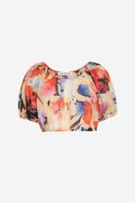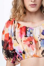 alfaiataria. Possui shape cropped, decote redondo, franzidos no busto e mangas curtas volumosas.