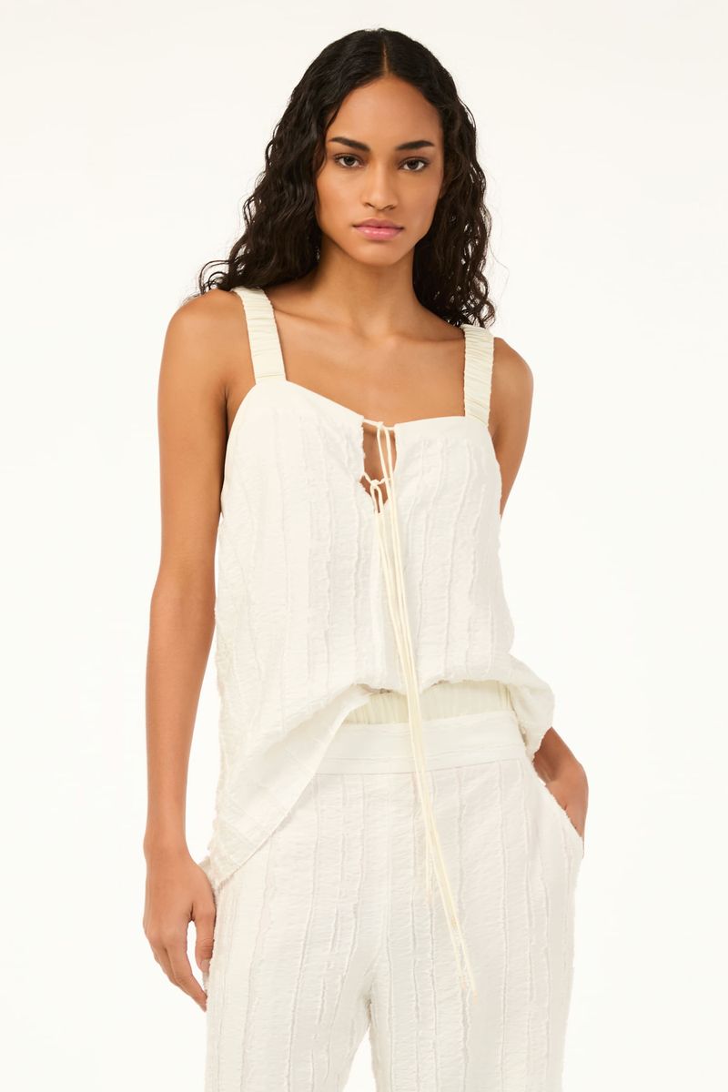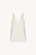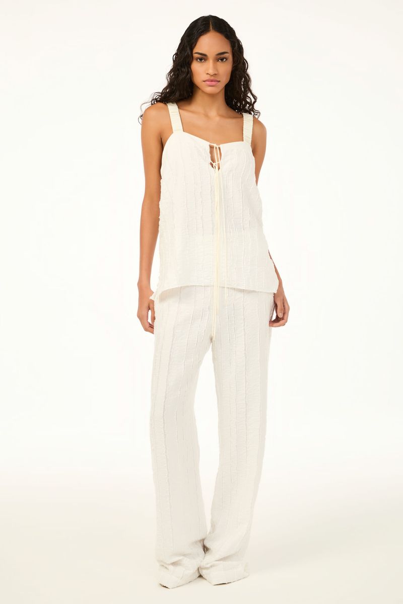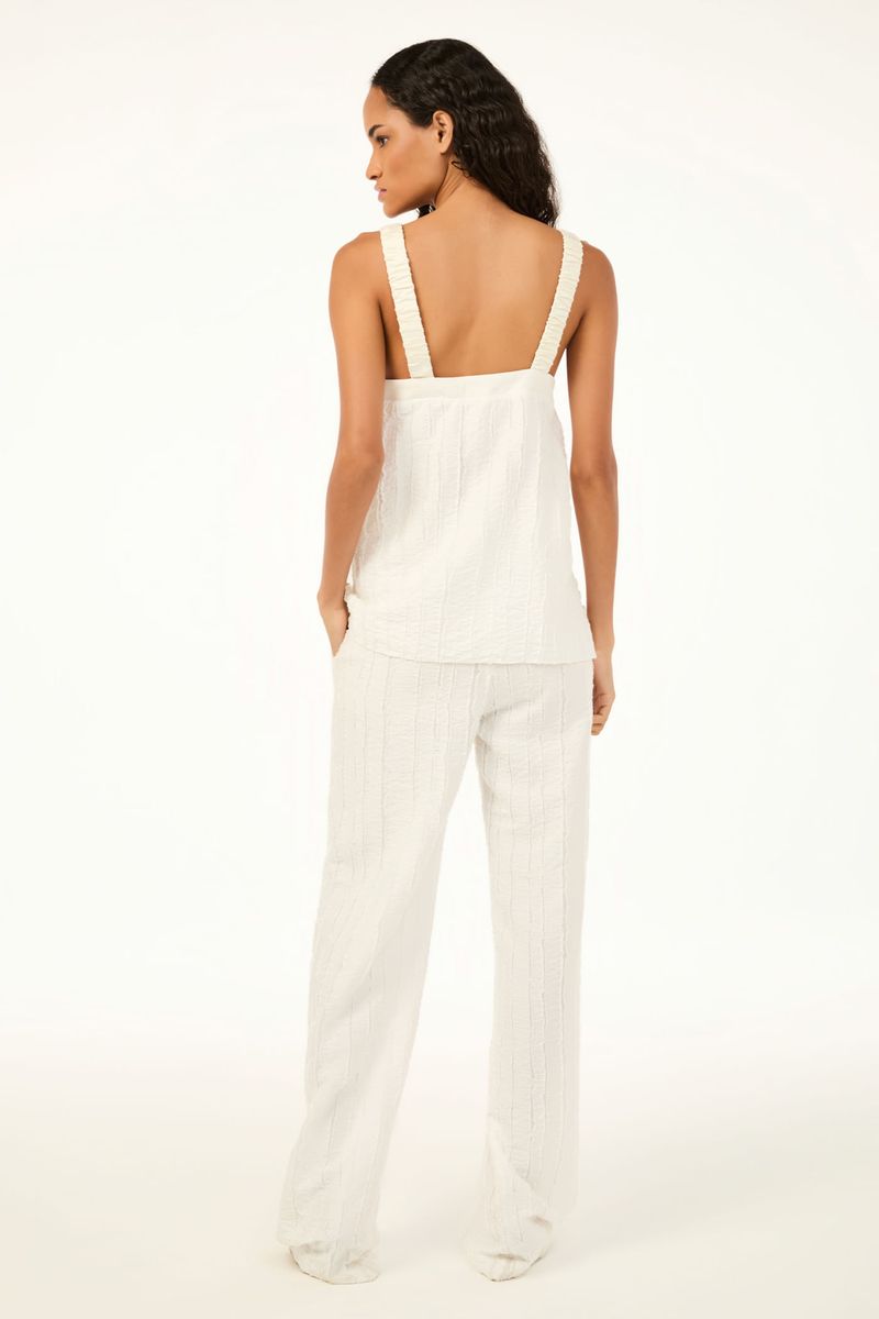 O top Dara CRIS BARROS é fresh e cool. De Dara, tecido misto de algodão e poliamida, leve e fluido e que traz listras irregulares e textura. Possui shape evasê, alças largas de isadora, decote reto com rolote para amarração , comprimento alongado e fendas laterais com botões forrados.