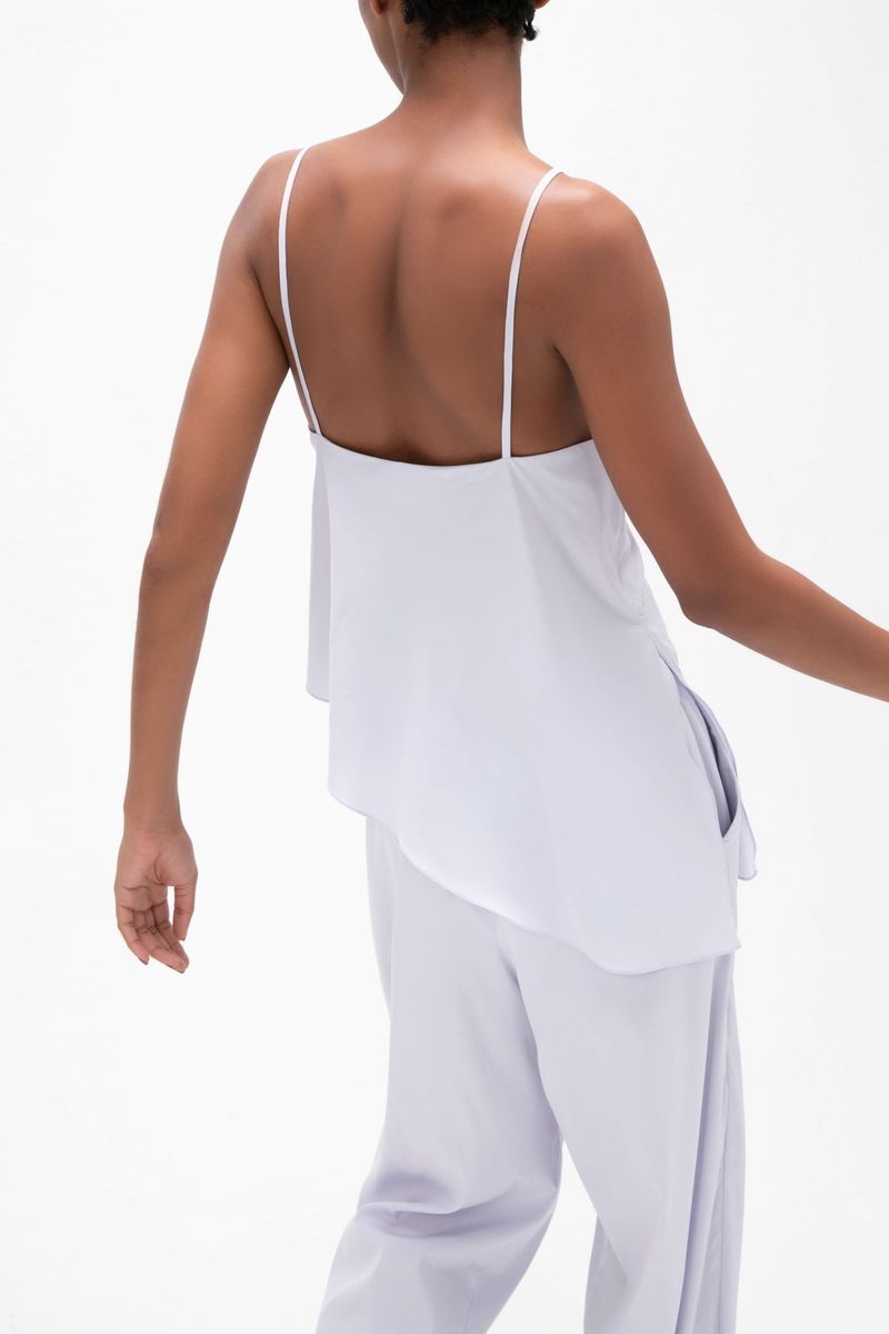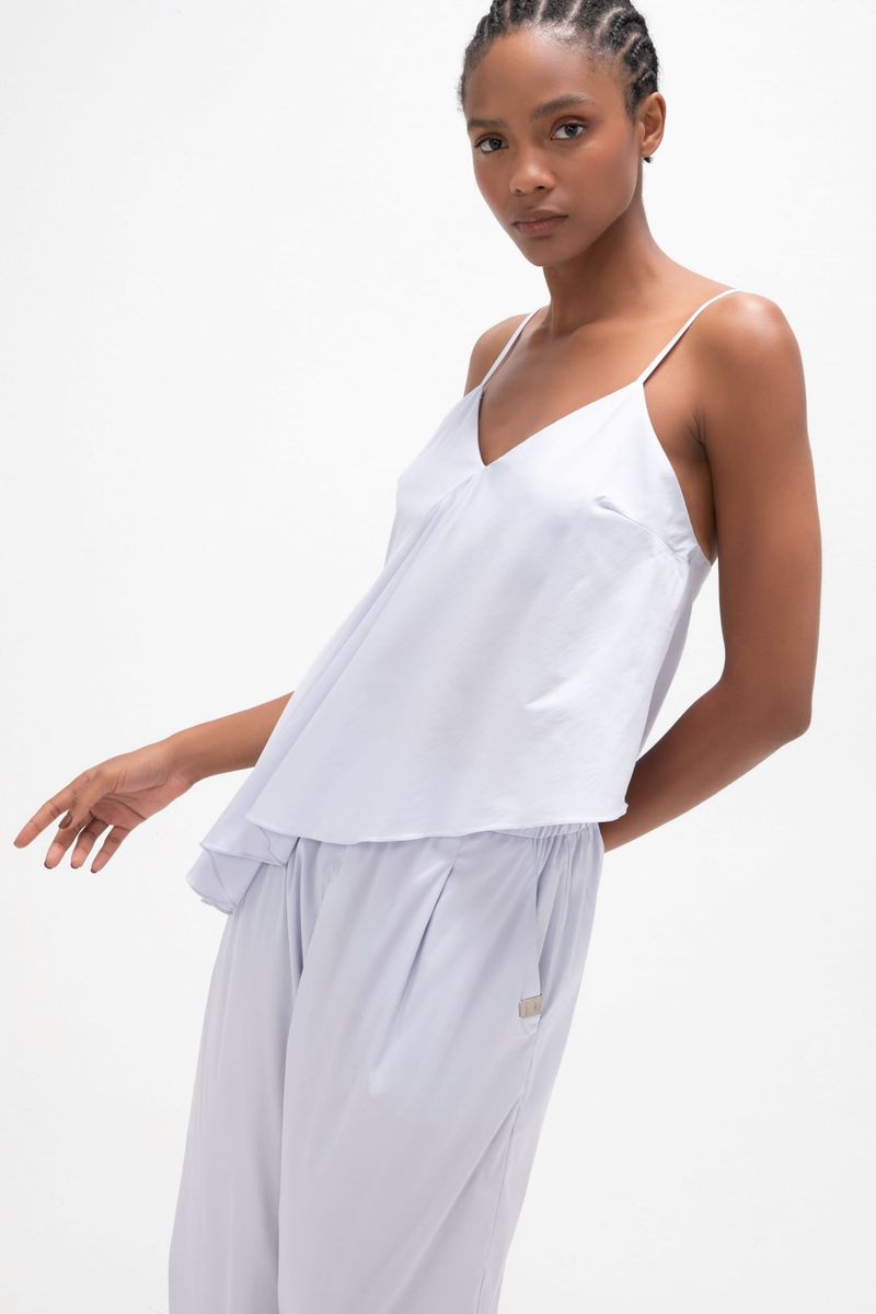 O top Dolly CRIS BARROS é cool e inusitado. De Eugênia, tecido misto, confortável com caimento leve e fluido, feito de fibra de origem renovável que possui a certificação TENCEL MODAL, garantindo manejo florestal sustentável e uma produção ecoeficiente. Possui decote V com recorte diagonal, barra assimétrica com babados e alças finas.