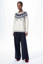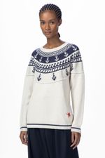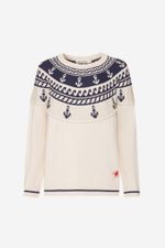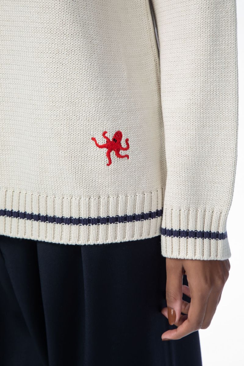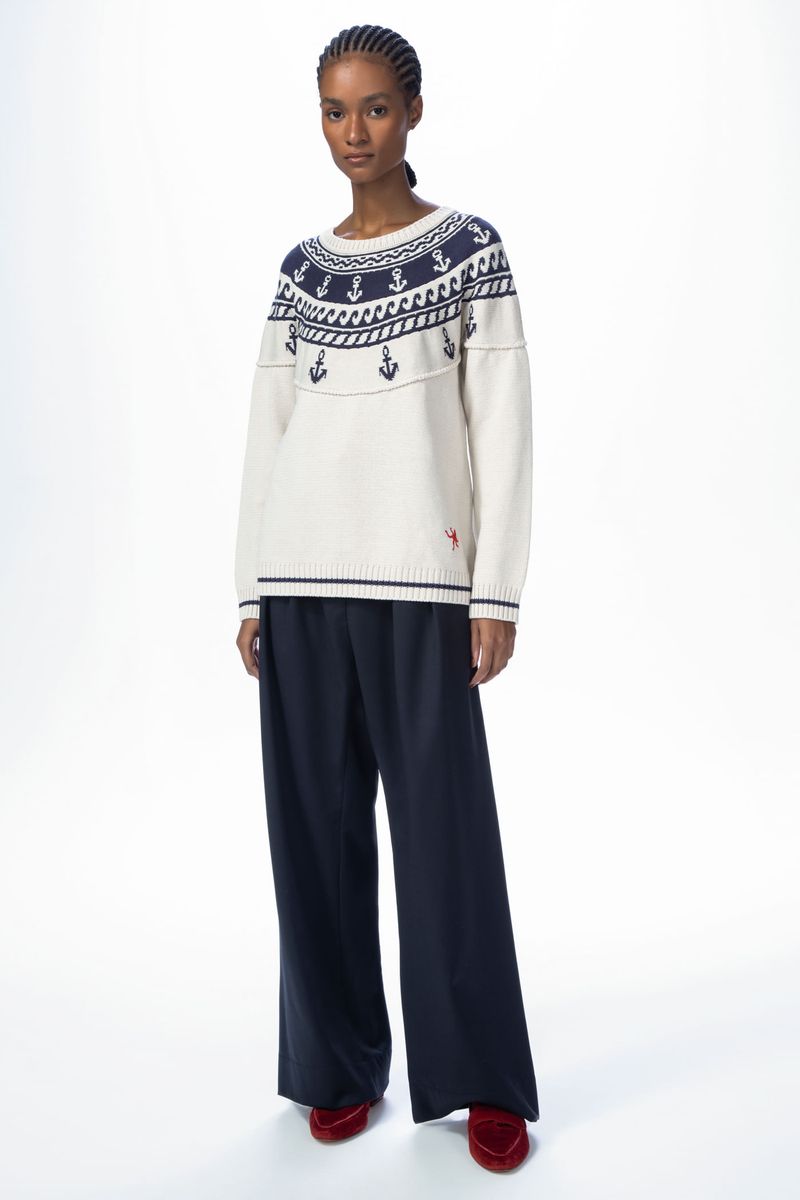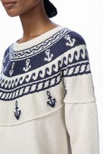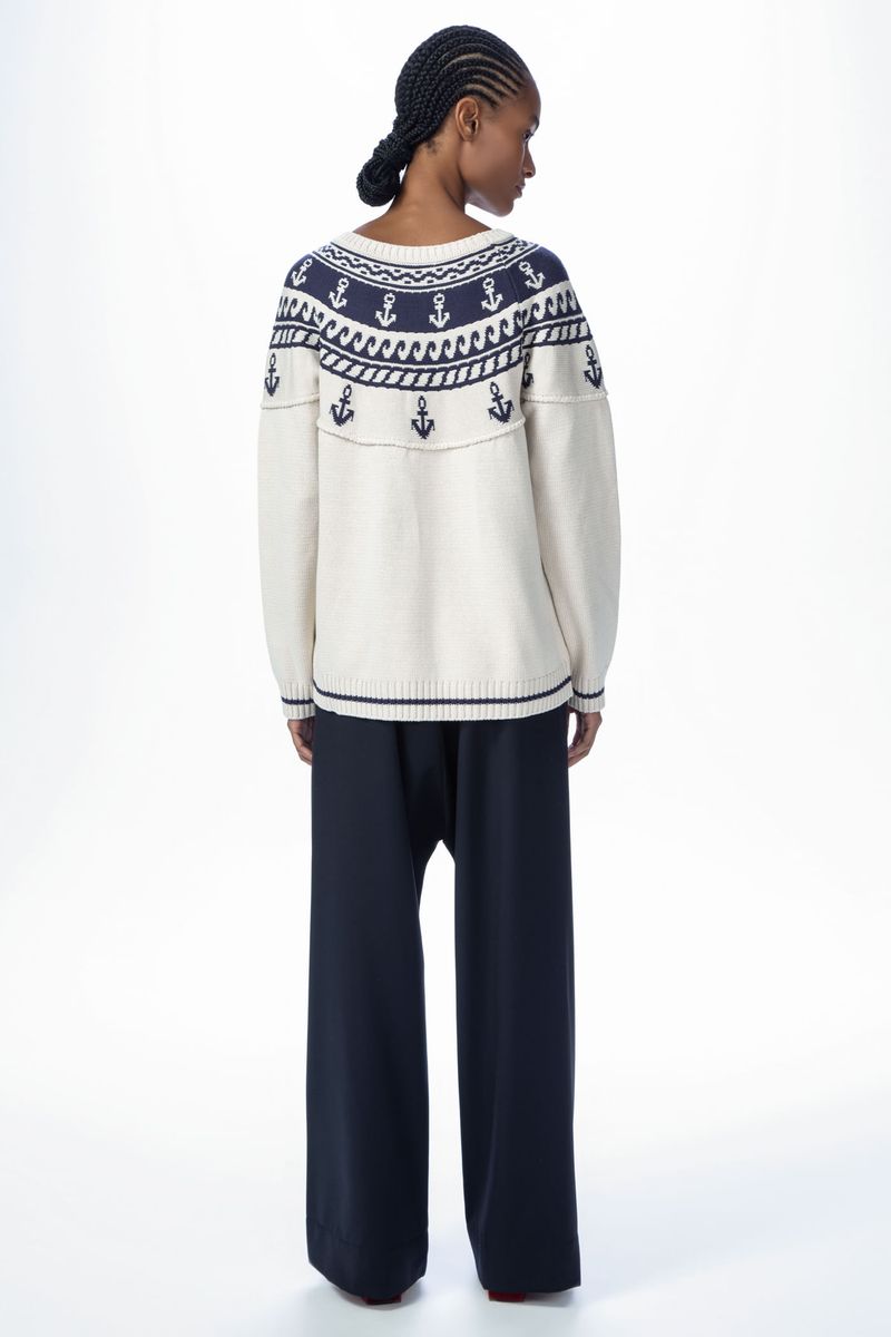 O top Dolly CRIS BARROS tem ar navy. De tricot, traz tramado exclusivo desenvolvido em nosso atelier,traz âncoras e motivos marinheiros, além de detalhe com polvo, de linha, bordado na barra. Possui decote careca e mangas longas.
