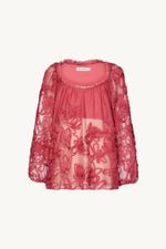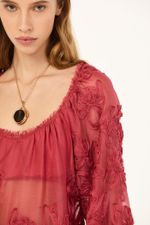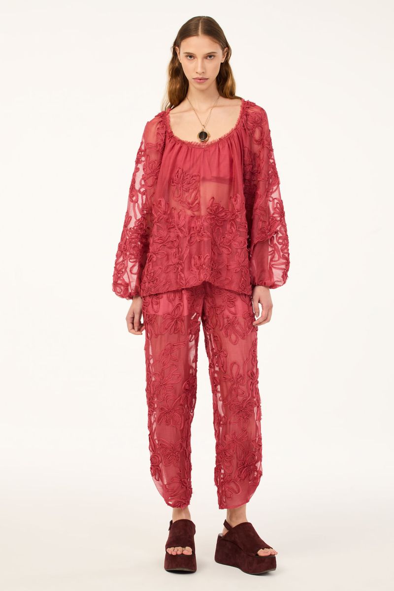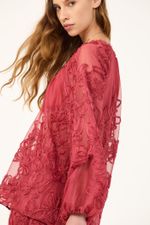 O top Doris CRIS BARROS é moderno e elegante. De Doris, tecido com transparência e leve efeito plissado, com detalhes de fitas do mesmo tecido, criando um floral abstrato moderno. Possui shape evasê, decote levemente coração e mangas longas volumosas com elástico nos punhos.