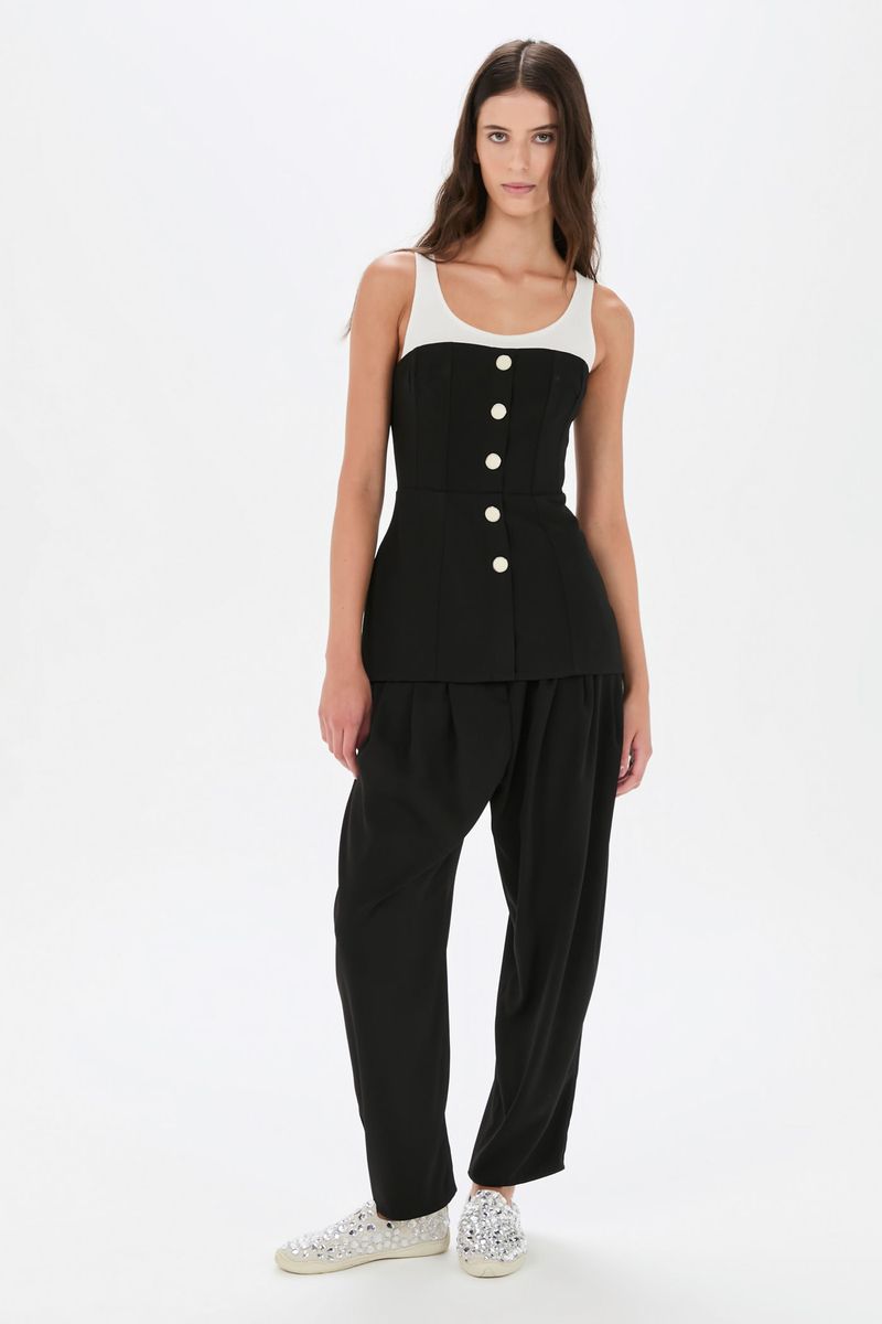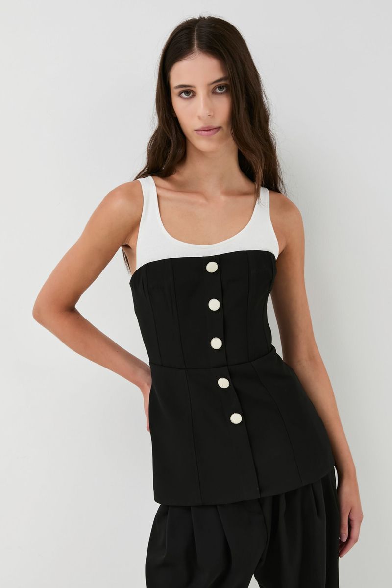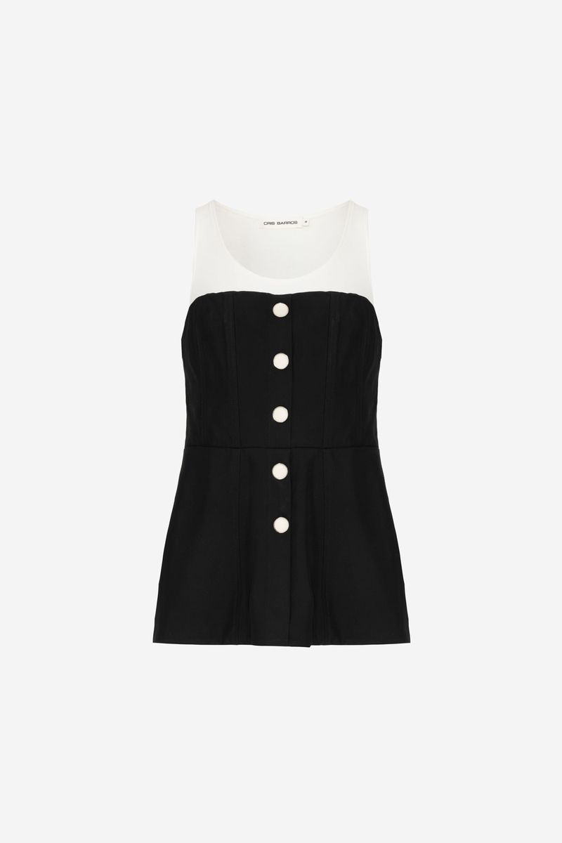 O top Elena CRIS BARROS é estiloso e elegante. De Avalon, nosso tecido clássico, encorpado e fluido, perfeito para alfaiataria e que possui certificação FSC, com maior responsabilidade ambiental, suas fibras são feitas a partir do manejo sustentável de áreas reflorestadas. Possui decote de malha Rib, alças largas, shape justo de corpete sobreposto, de Avalon, cintura marcada, recortes e vista com botões jóias com design exclusivo, desenvolvido em nosso atelier, comprimento alongado e fechamento por zíper invisível lateral.