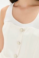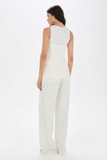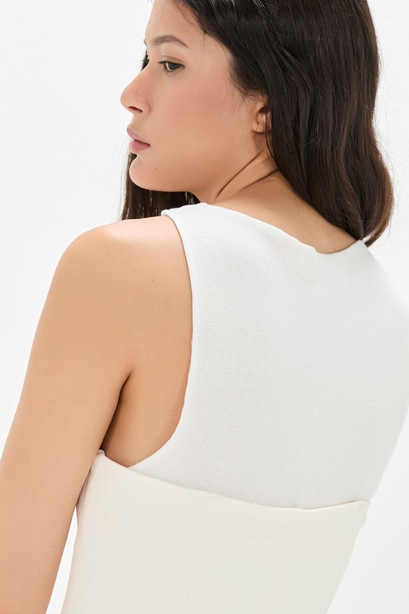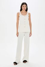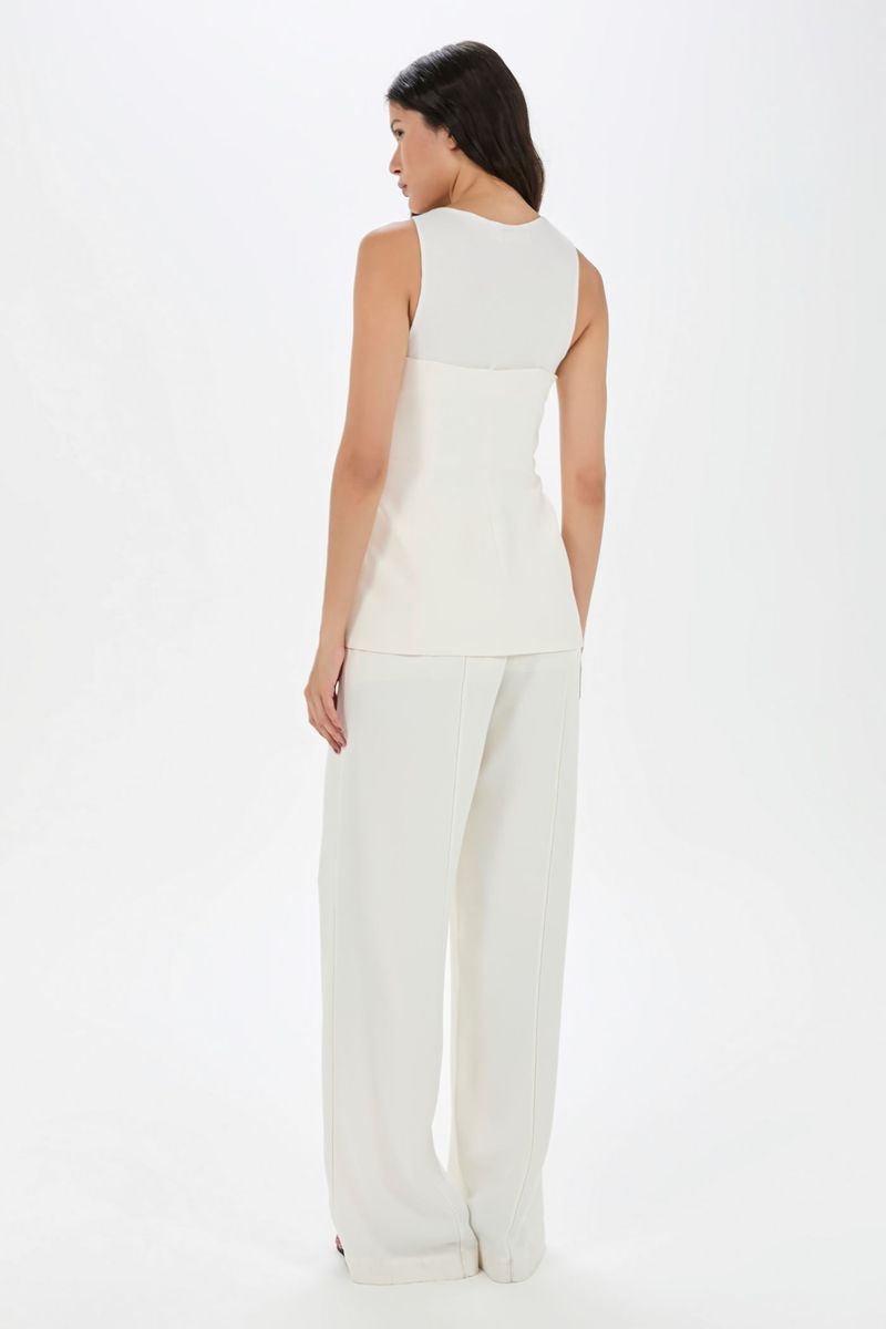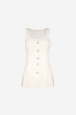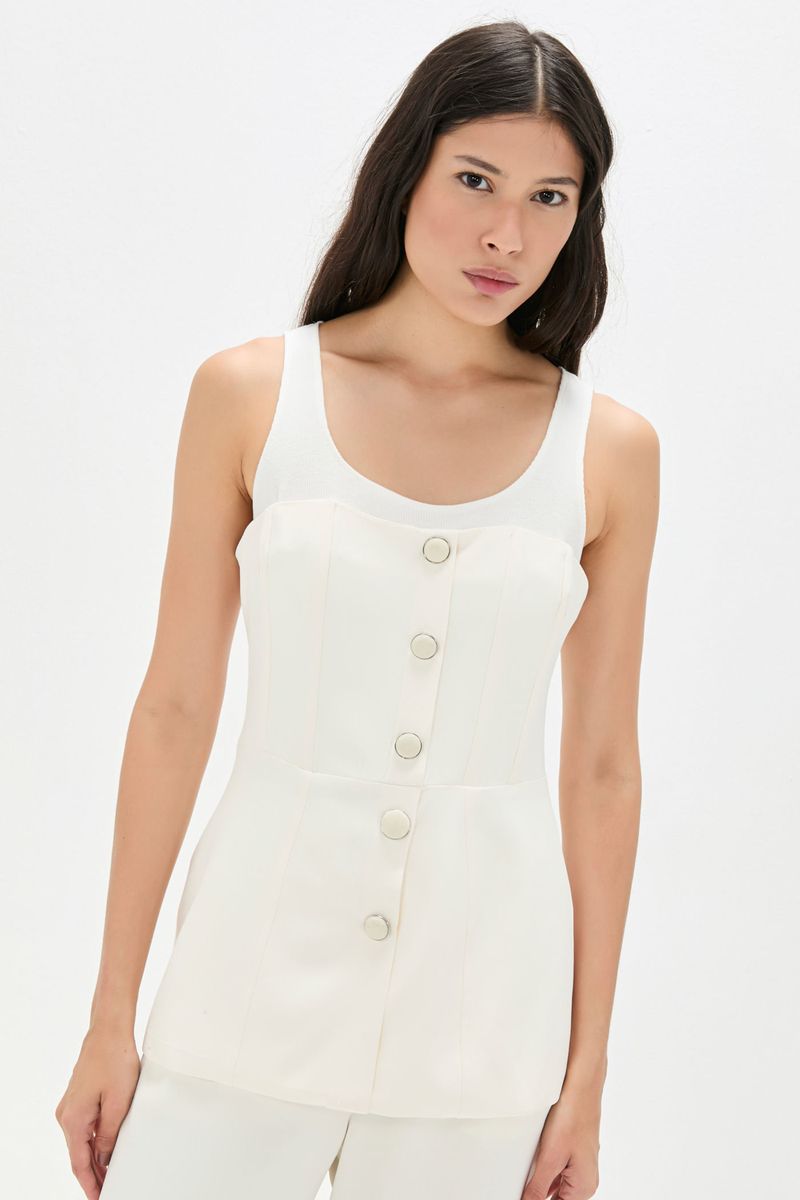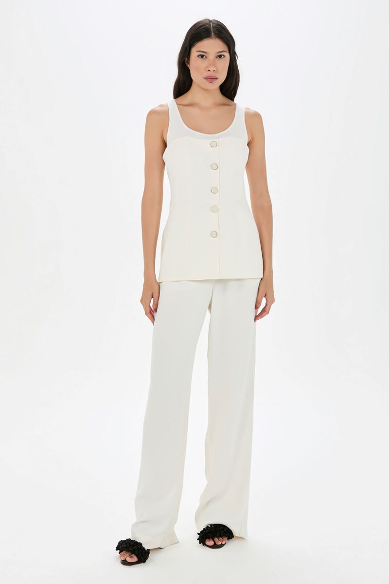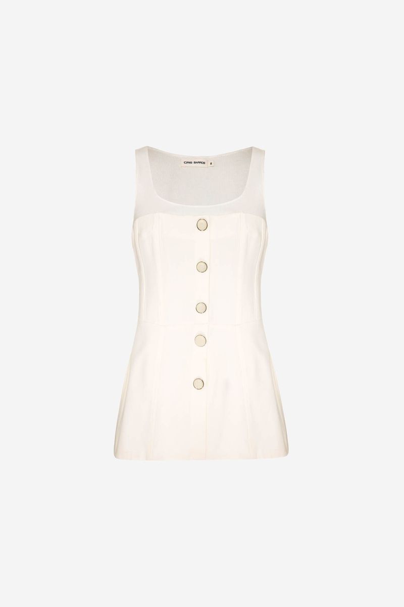 O top Elena CRIS BARROS é estiloso e elegante. De Avalon, nosso tecido clássico, encorpado e fluido, perfeito para alfaiataria e que possui certificação FSC, com maior responsabilidade ambiental, suas fibras são feitas a partir do manejo sustentável de áreas reflorestadas. Possui decote de malha Rib, alças largas, shape justo de corpete sobreposto, de Avalon, cintura marcada, recortes e vista com botões jóias com design exclusivo, desenvolvido em nosso atelier, comprimento alongado e fechamento por zíper invisível lateral.
