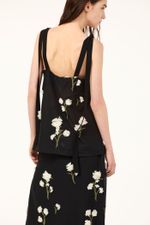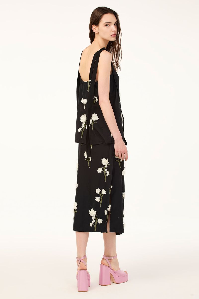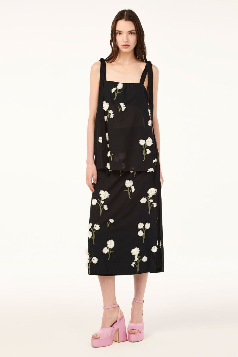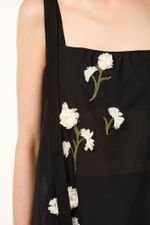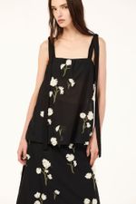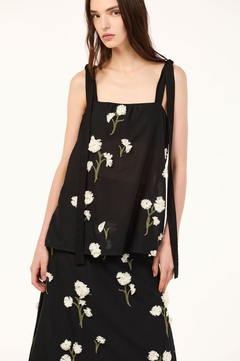 O top Ella CRIS BARROS é sofisticado e delicado. De Ávila, voil 100% algodão bordado com cravos delicadamente recortados e aplicados em cada caule, criando o efeito de um jardim 3D. Possui shape reto evasê, decote reto, alças largas com amarração de Isadora.