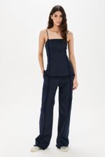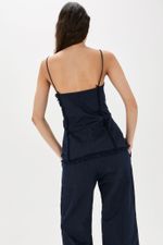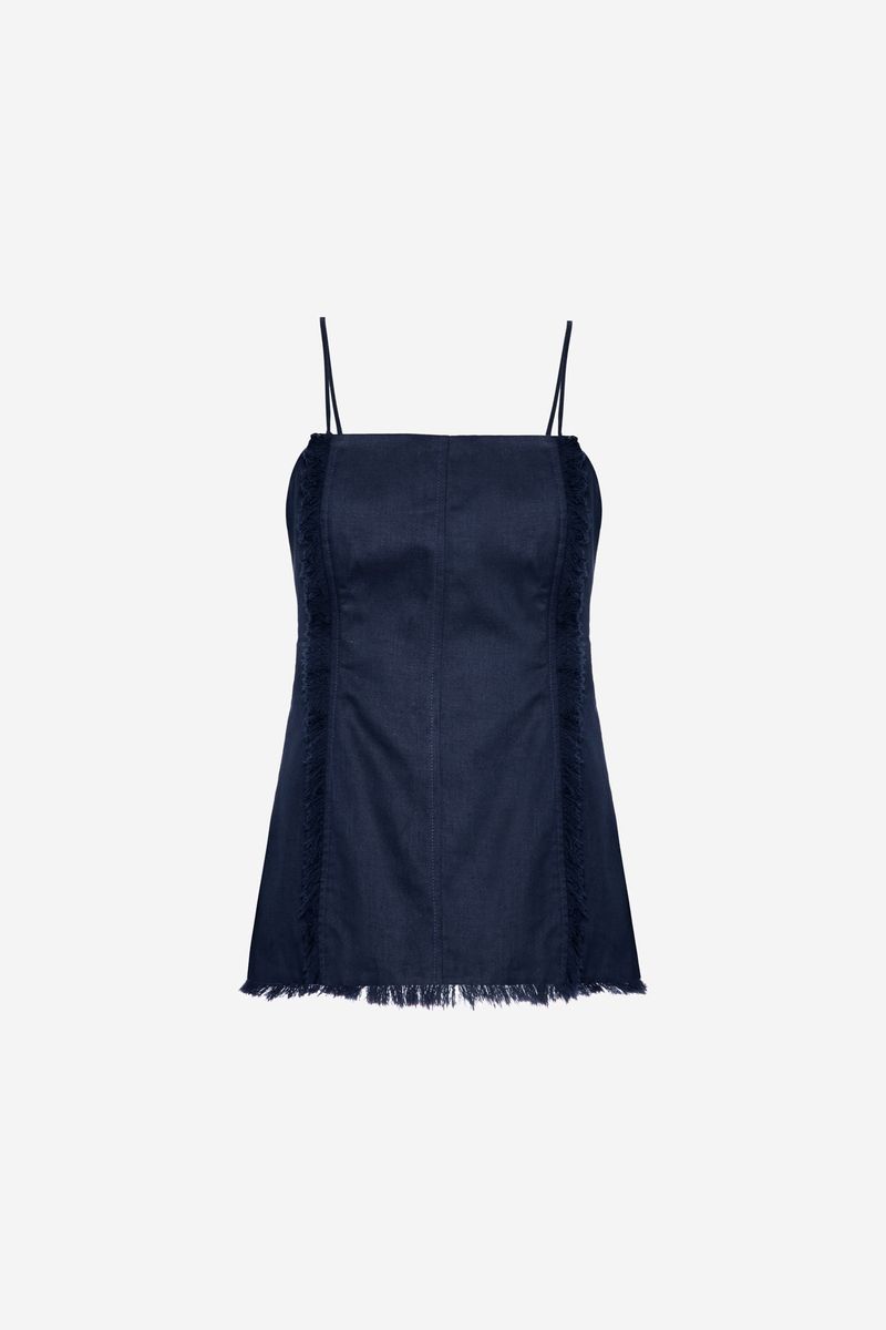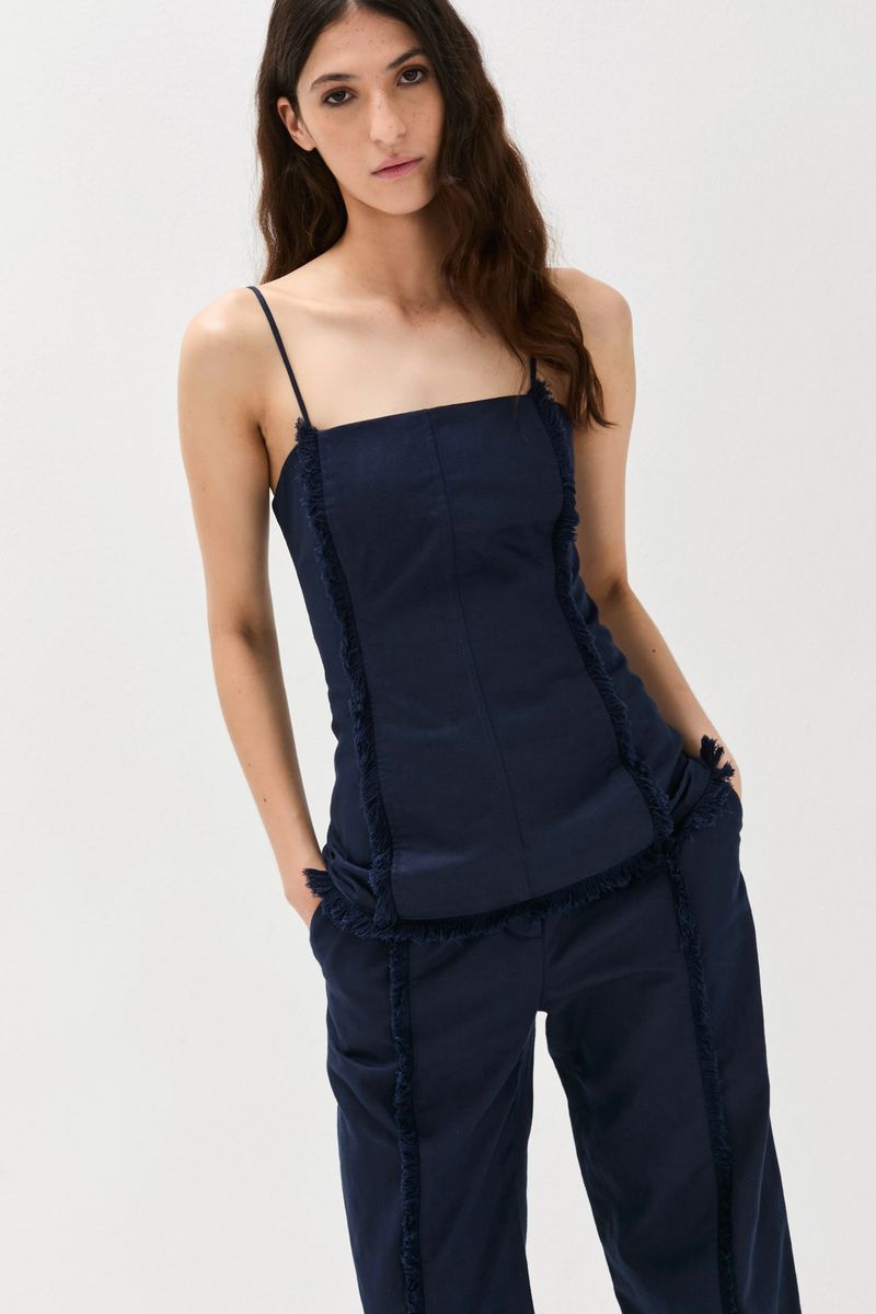O top Estelle CRIS BARROS é fashionista. De Mia, nossa sarja que mescla duas fibras naturais: algodão e cânhamo. Possui shape justo, decote reto, alças finas, detalhes de recortes frontais desfiados e fechamento por zíper invisível lateral.