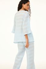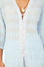 O top Ester CRIS BARROS é cool e moderno. De Tâmisa, tecido leve, com texturas e fluidez. Possui shape reto, mangas curtas, gola V, com vista de Isadora e fechamento por botões de pérola.