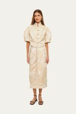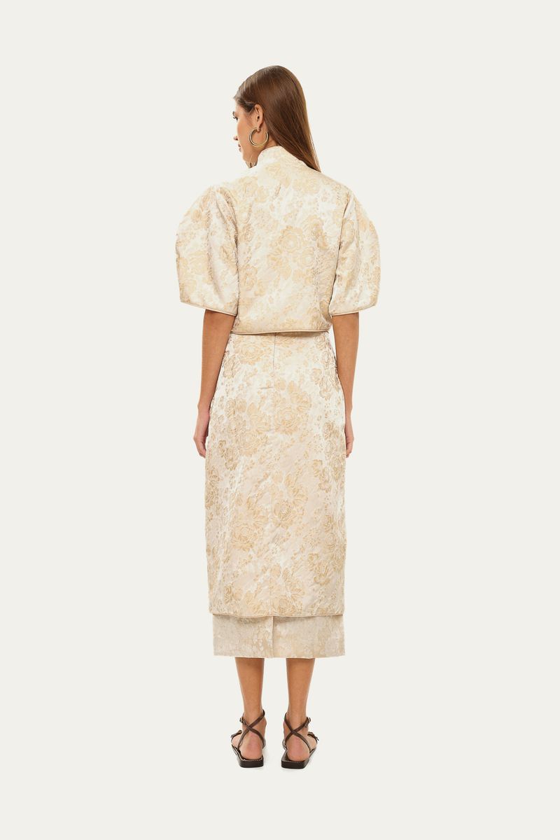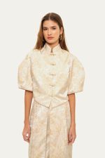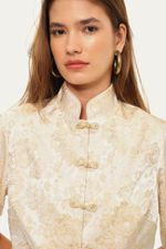 Esta peça exala uma elegância singular. Confeccionada a partir de uma refinada mistura de poliéster e rayon, a blusa se distingue pelas suas mangas em shape ovo, adornadas por um delicado jacquard de rosas. A gola alta e os sofisticados abotoamentos chineses frontais arrematam o design, conferindo um charme discreto e contemporâneo.