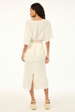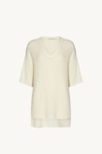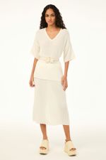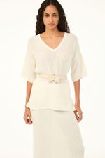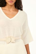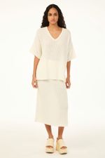 O top Hoya CRIS BARROS é cool e comfy. De tricot, com ponto com leve transparência. Possui shape solto e alongado, decote V, ombros levemente deslocados, mangas curtas e fendas laterais.