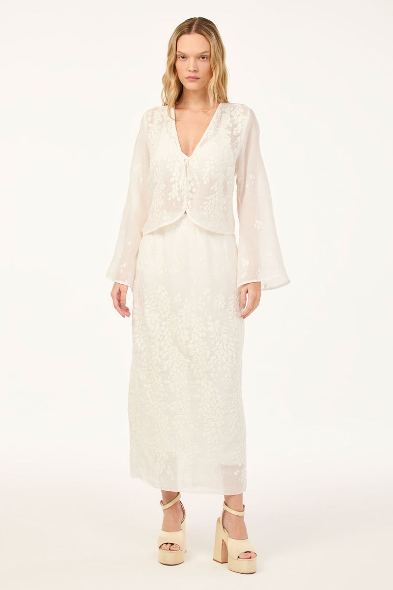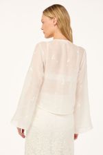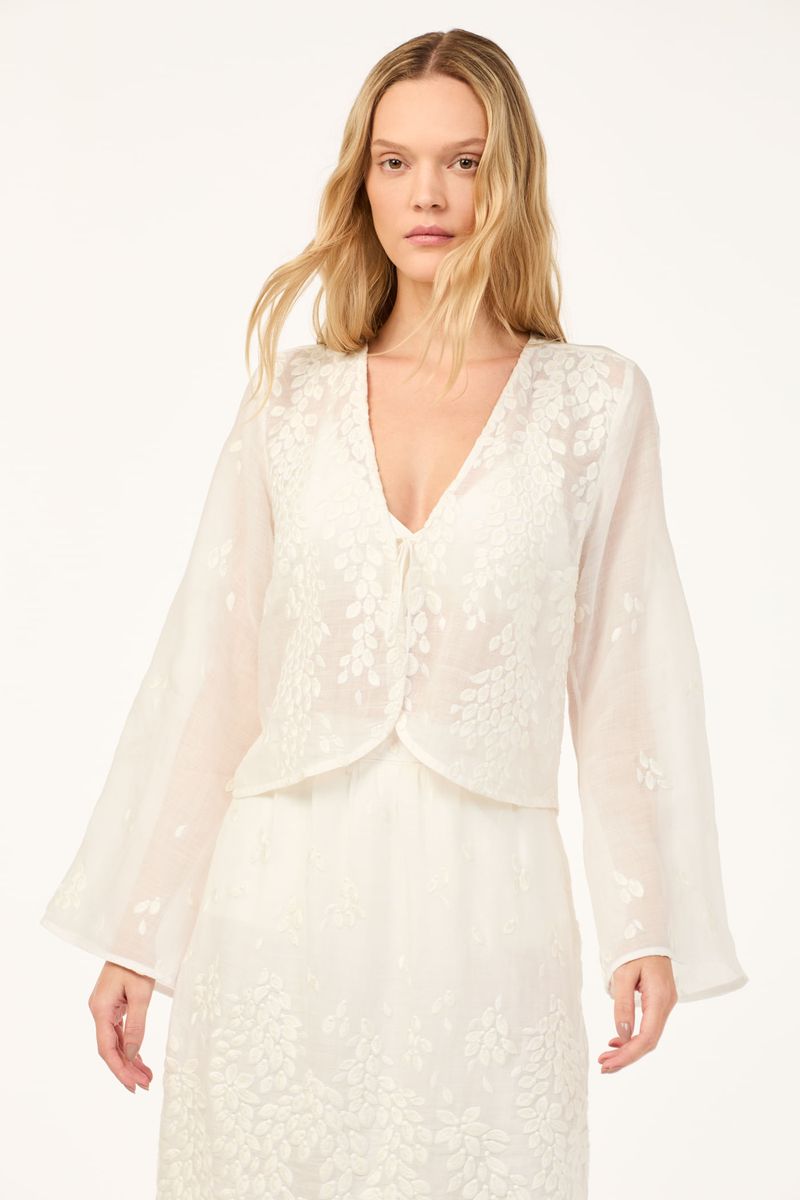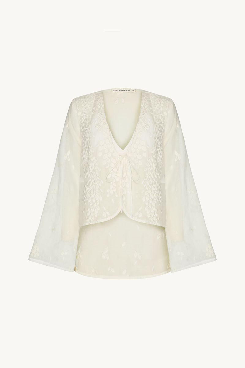 O top Iria CRIS BARROS é chique e marcante. De Aura, voil 100% linho, bordado localizado com pequenas folhas em efeito cascata. Possui shape reto, mangas longas amplas e decote V com rolote para amarração. Acompanha sutiã de malha.