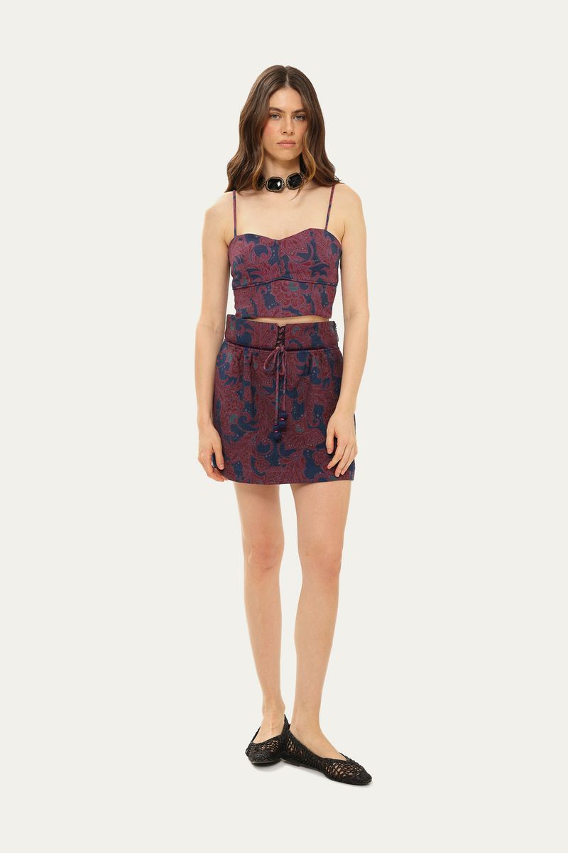 Fechamento lateral por zíper de metal. Confeccionado em jacquard exclusivo.