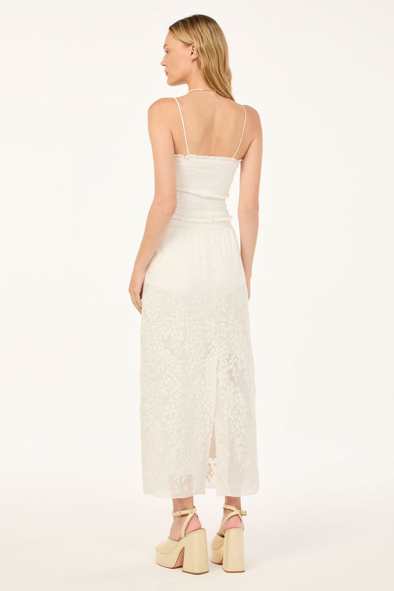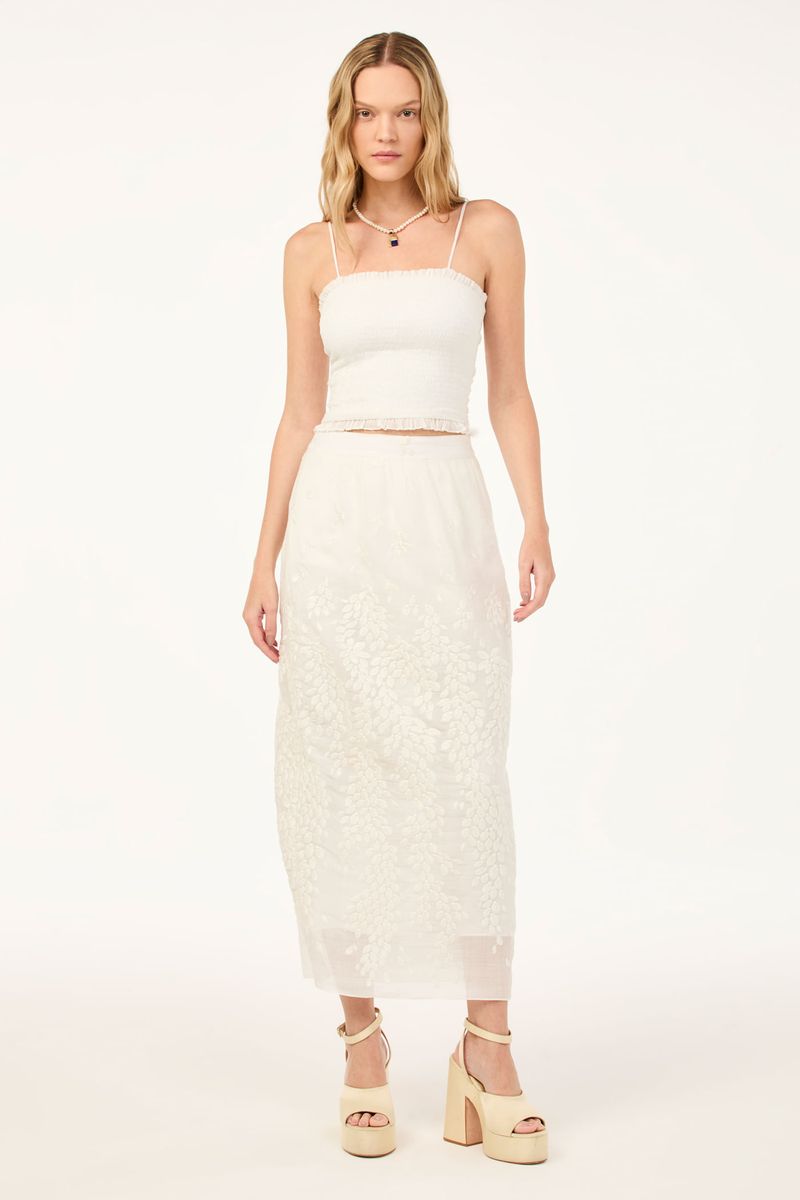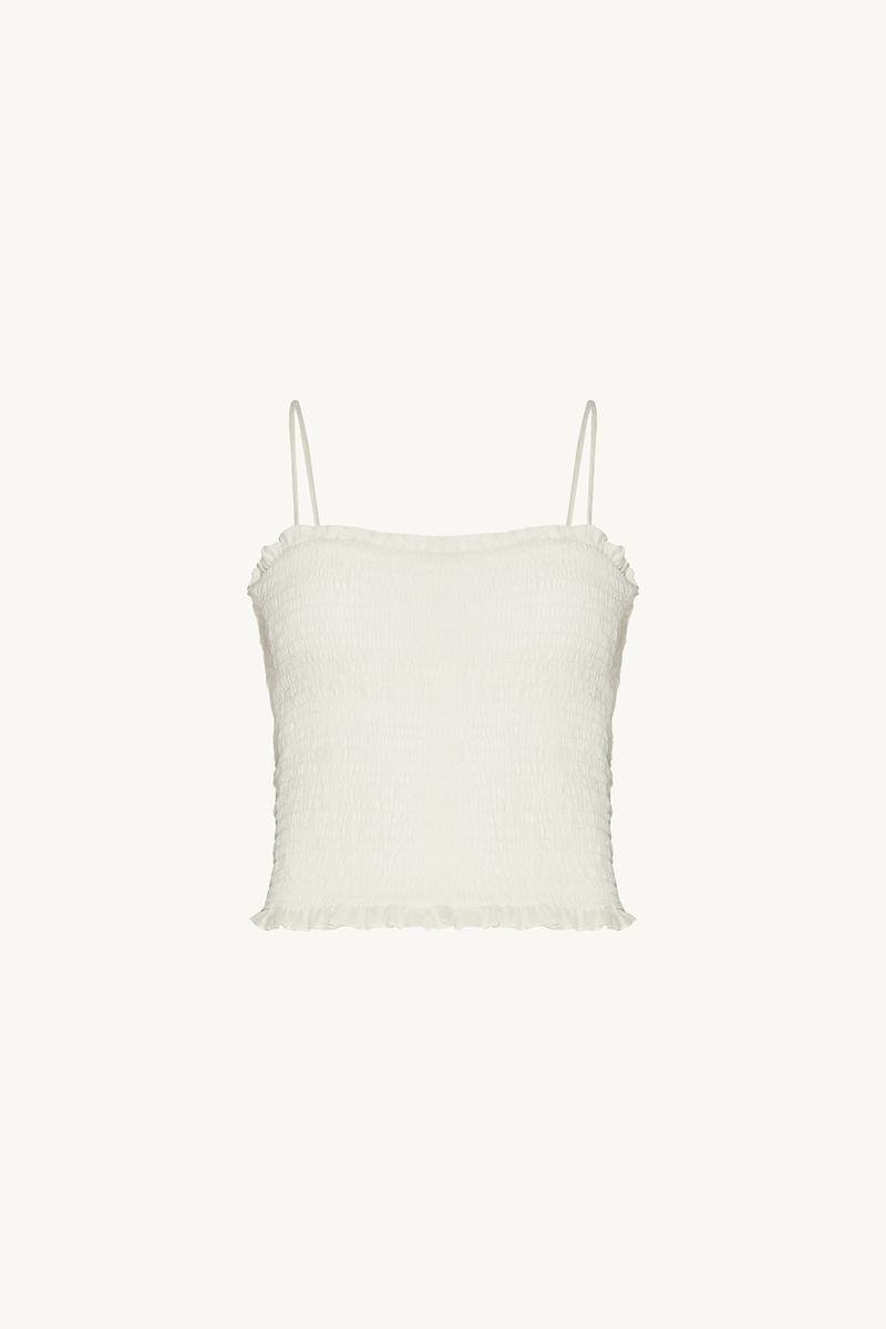 O top Kate CRIS BARROS é um básico with a twist. De Ariela, voil de linho puro, leve porém estruturado. Possui shape justo e curto, inteiro de lastex, alças finas, decote reto e detalhes de mini babados no decote e na barra.