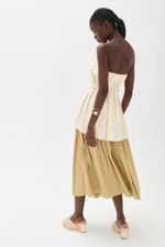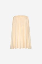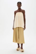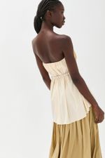 O top Leda CRIS BARROS é De Eugênia, tecido misto, confortável com caimento leve e fluido, feito de fibra de origem renovável que possui a certificação TENCEL MODAL, garantindo manejo florestal sustentável e uma produção ecoeficiente. Possui shape amplo e alongado, sem alças, franzido no decote, caimento evasê e busto interno de malha.