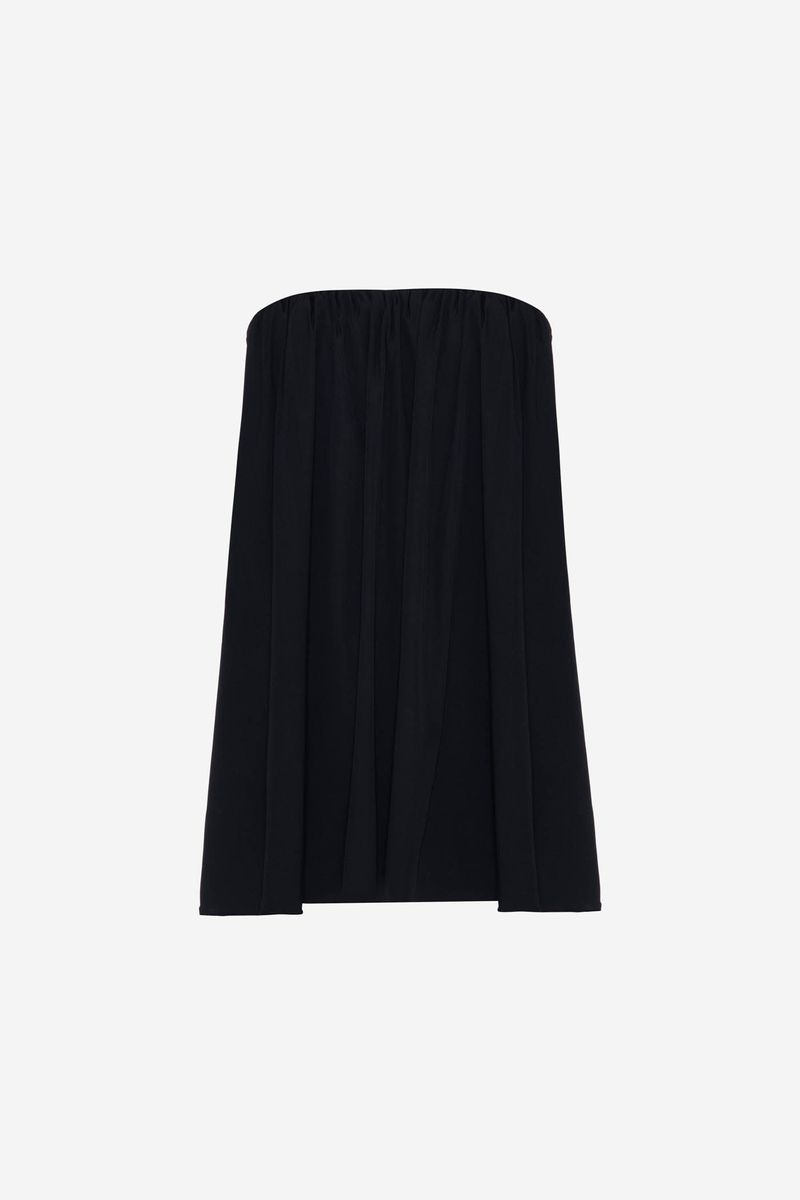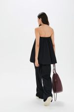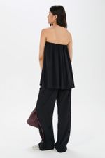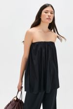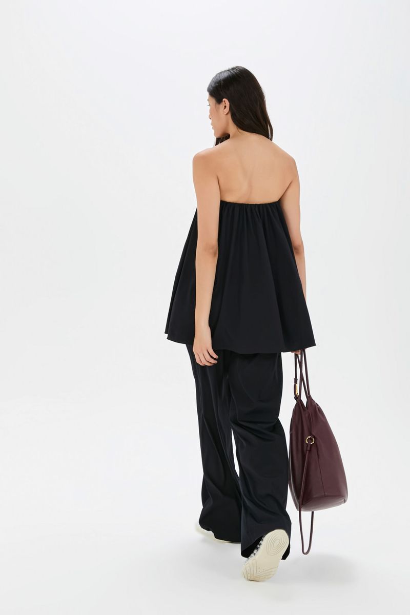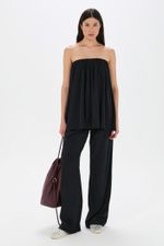 O top Leda CRIS BARROS é De Eugênia, tecido misto, confortável com caimento leve e fluido, feito de fibra de origem renovável que possui a certificação TENCEL MODAL, garantindo manejo florestal sustentável e uma produção ecoeficiente. Possui shape amplo e alongado, sem alças, franzido no decote, caimento evasê e busto interno de malha.