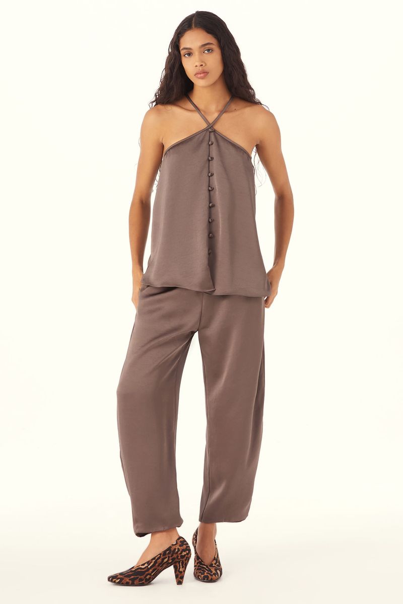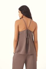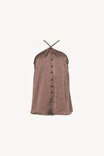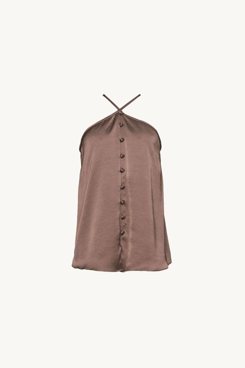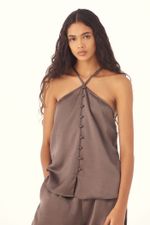 O Top Limona traduz minimalismo preciso, onde linhas essenciais e presença contemporânea se encontram. Confeccionado em Selene, cetim com brilho suave e estrutura mais encorpada, revela toque muito macio no corpo e fluidez no caimento. A peça traz rolotê no decote frente e costas, vista sem função com azelhas e botões forrados meia bola em fileira central, além de amarração posterior; o shape solto ao corpo com caimento evasê é arrematado por fenda discreta na barra e acabamento limpo, em equilíbrio entre o simples e o sofisticado.