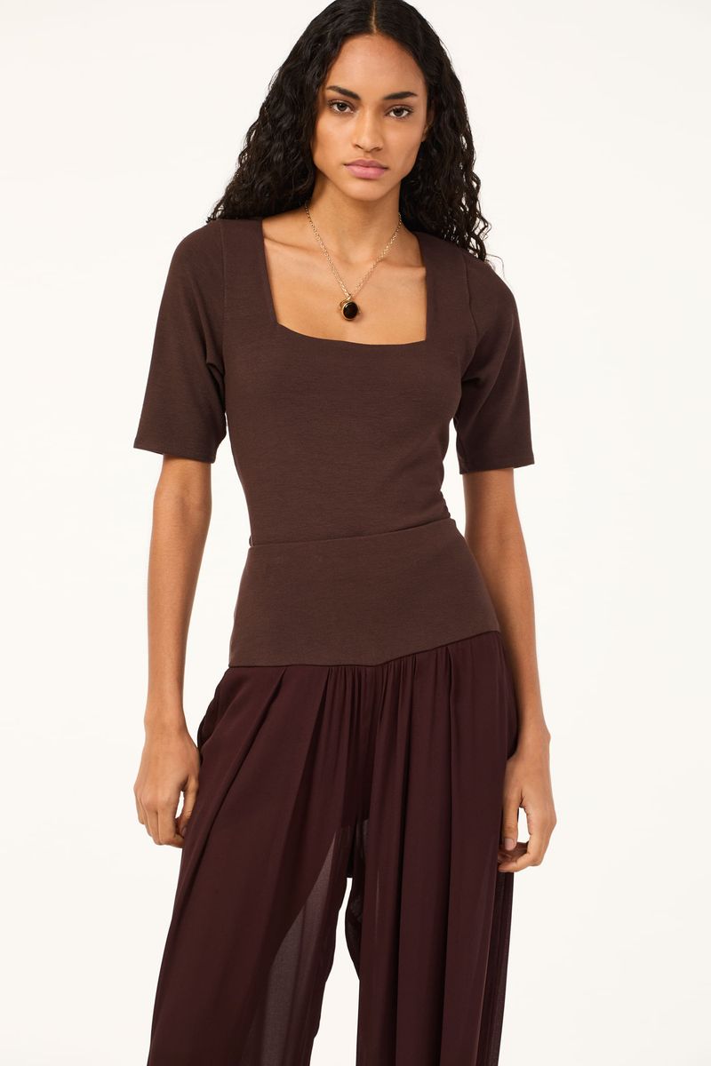 O top Lina CRIS BARROS é um básico elegante. De Marjorelle, nossa clássica malha creponada de toque macio que garante muito conforto e sofisticação, feito com fibra de origem natural que possui a certificação LENZING ECOVERO garantindo uma produção com baixos impactos ambientais. Possui shape justo, mangas curtas e decote quadrado.