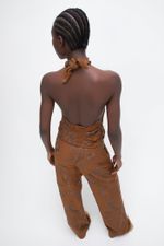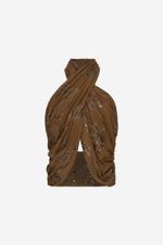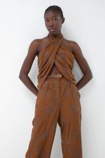 O top Nanai CRIS BARROS é moderno e estiloso. De Folhagem, tecido exclusivo com bordado corrido em padrão de ramos repletos de folhagens e flores exóticas desenvolvido em nosso atelier. Possui shape frente única transpassado com amarração no pescoço, todo drapeado e lastex nas costas para garantir conforto e caimento perfeito.