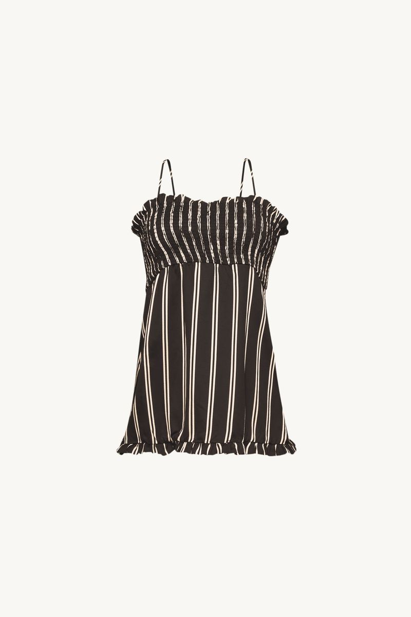 O Top Nella traduz uma feminilidade precisa, onde leveza e construção se encontram em harmonia. Confeccionado em Biarritz, uma reinterpretação da alfaiataria clássica e atemporal italiana, constrói presença com toque fluido e textura natural. O decote reto com alças finas ganha babado no acabamento, enquanto o lastex em toda a região do busto desenha o corpo com conforto; o recorte abaixo do busto abre em caimento evasê até a base, finalizado por babado na barra e fechamento por zíper, com assinatura CRIS BARROS em um selo discreto no interior.