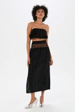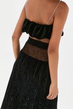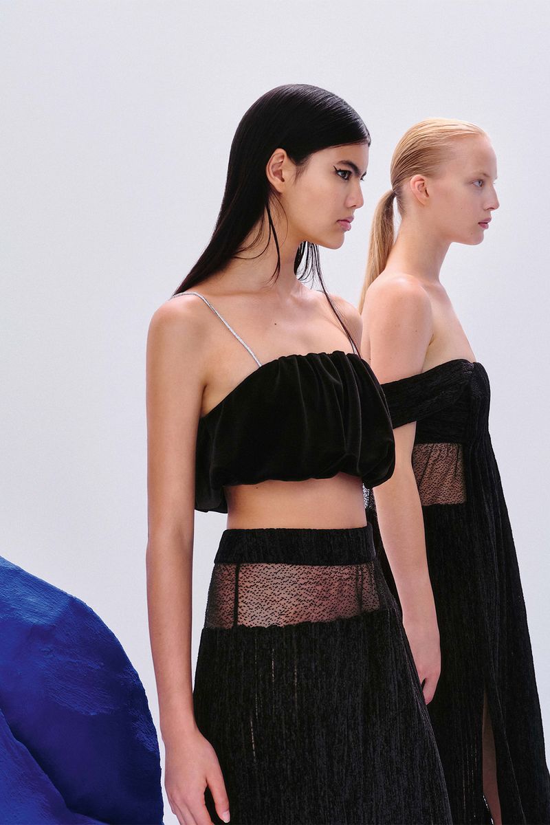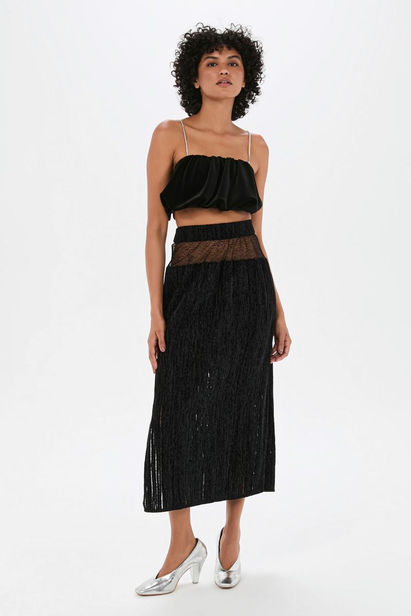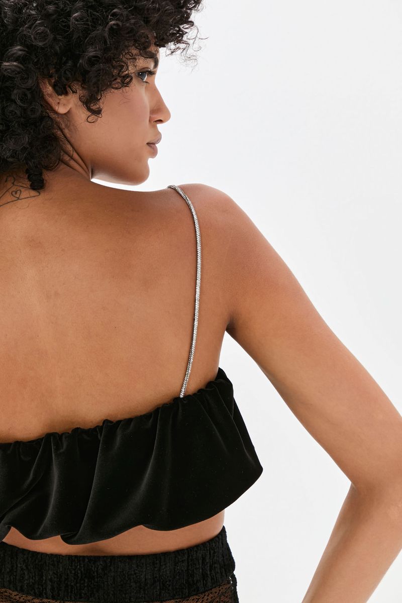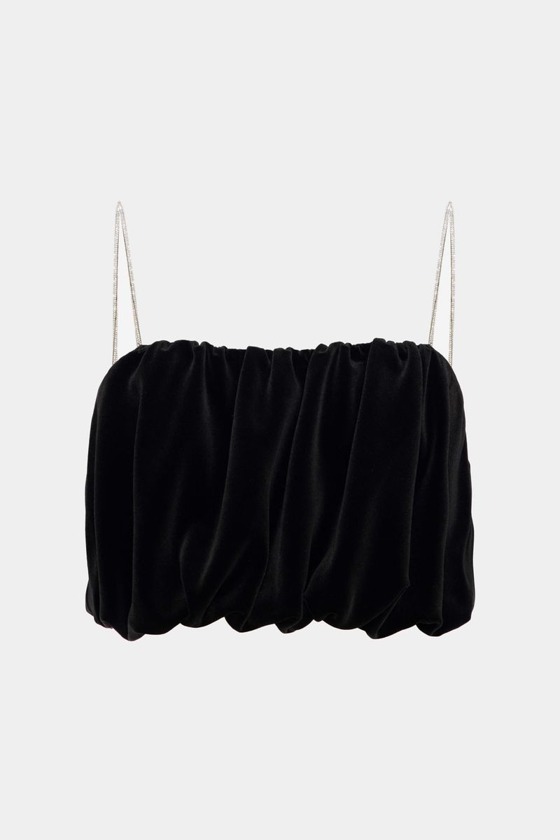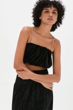 O top Ninfeia CRIS BARROS é fashionista e marcante. De Alamo, nosso veludo encorpado de toque macio, fluido e com um leve brilho acetinado. Possui decote reto, comprimento curto, alças finas brilhantes e caimento balonê.