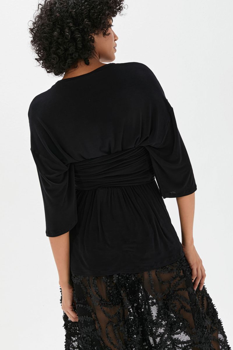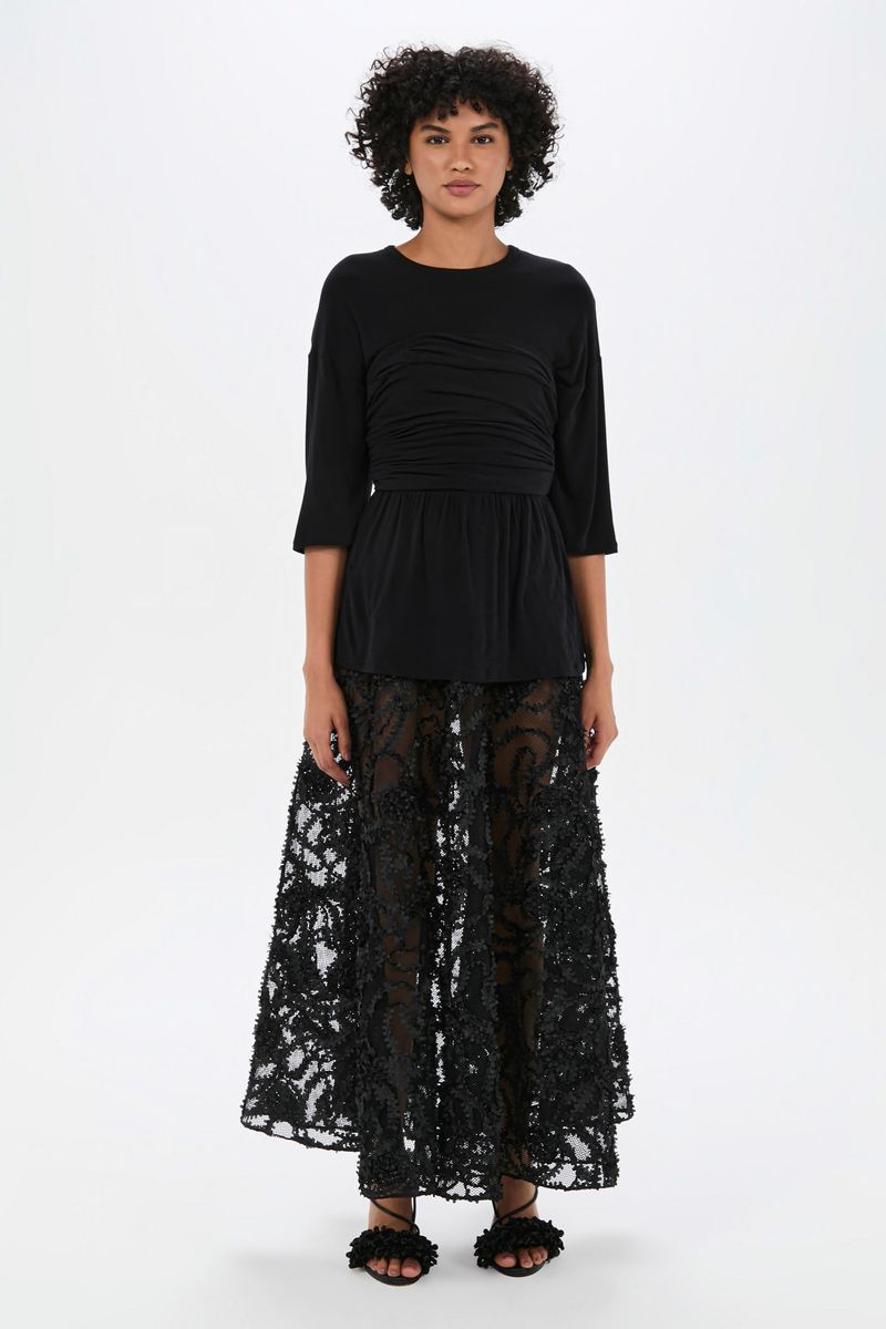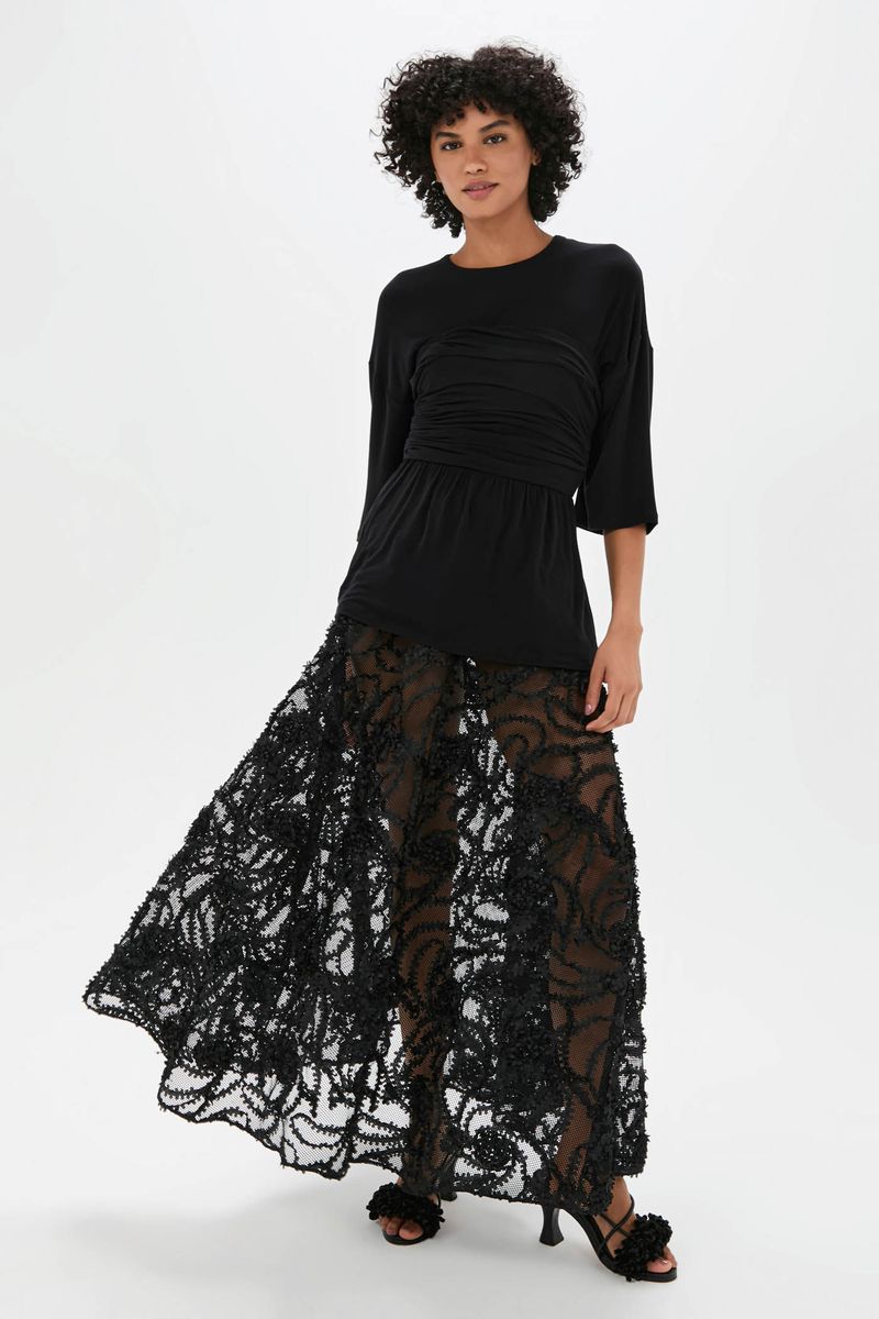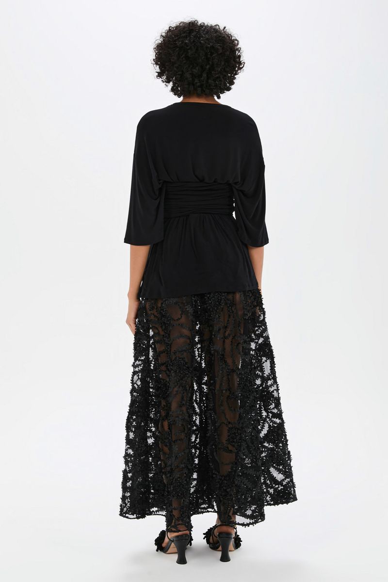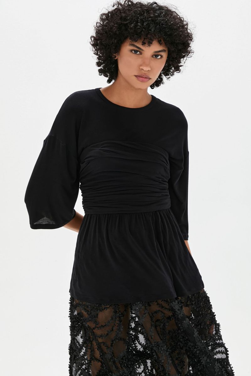 O top Noreia CRIS BARROS é fashionista e inusitado. De Odessa, nossa malha de viscose ultra fina, super confortavél para o dia a dia. Possui decote careca, mangas curtas, pala franzida fixa sobreposta do busto ate a cintura e comprimento alongado.