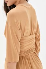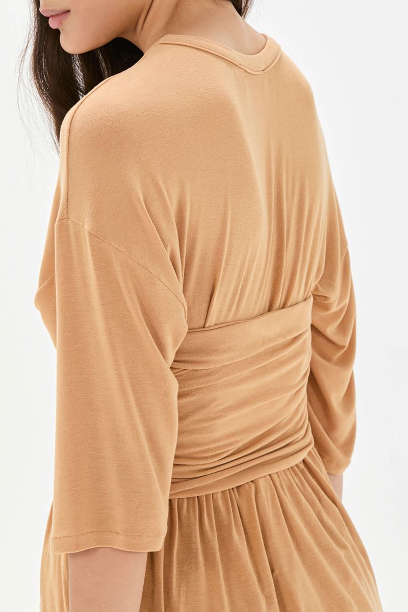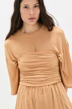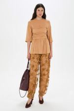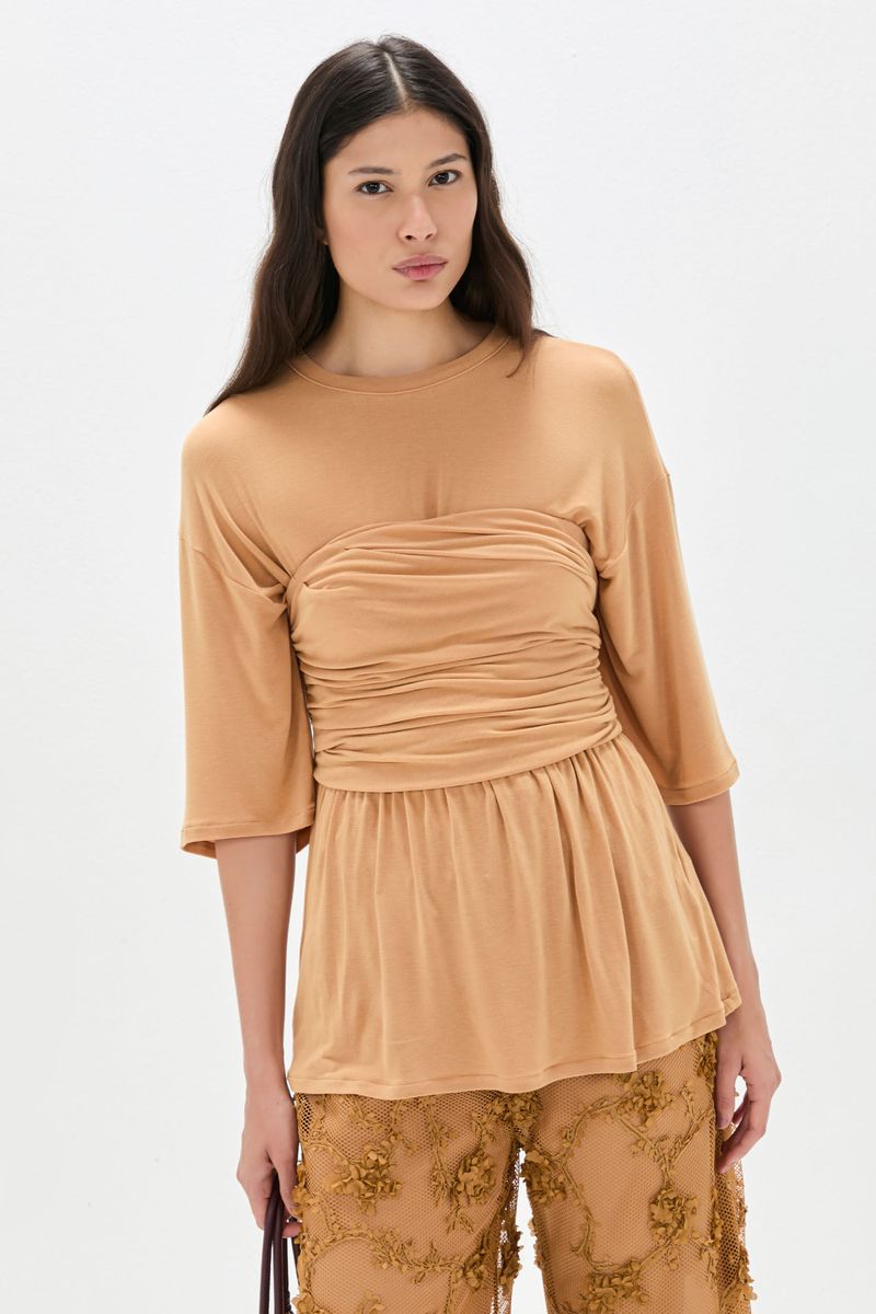 O top Noreia CRIS BARROS é fashionista e inusitado. De Odessa, nossa malha de viscose ultra fina, super confortavél para o dia a dia. Possui decote careca, mangas curtas, pala franzida fixa sobreposta do busto ate a cintura e comprimento alongado.