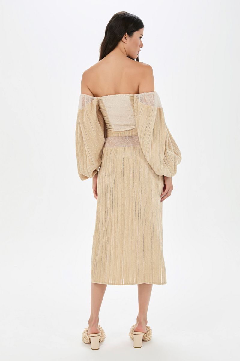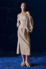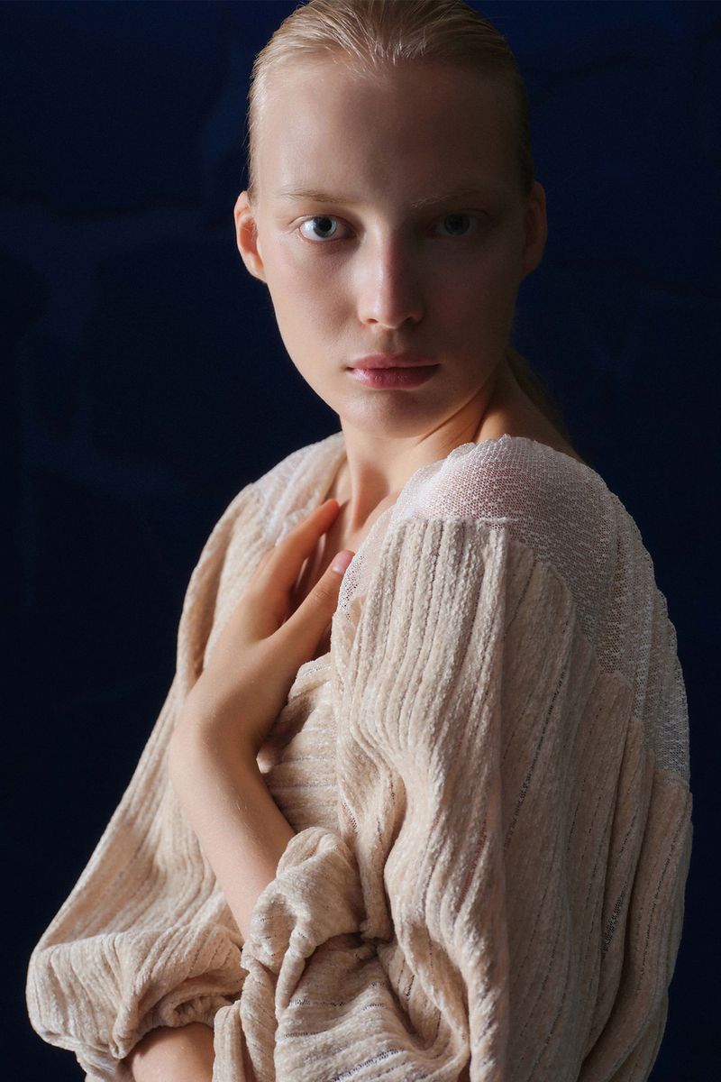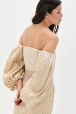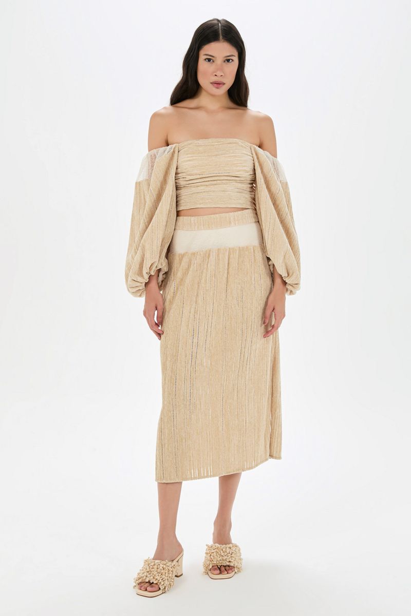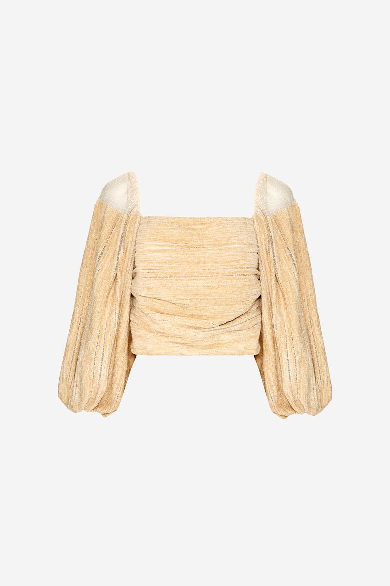 O top Pilar CRIS BARROSé elegante e estiloso. De Prelúdio, tule coberto por listras feitas com fio de lã chenille que criam efeito cotelê. Possui shape justo drapeado, decote reto, mangas bufantes com comprimento médio e transparência e lastex posterior para garantir o conforto e caimento perfeito.
