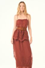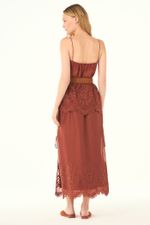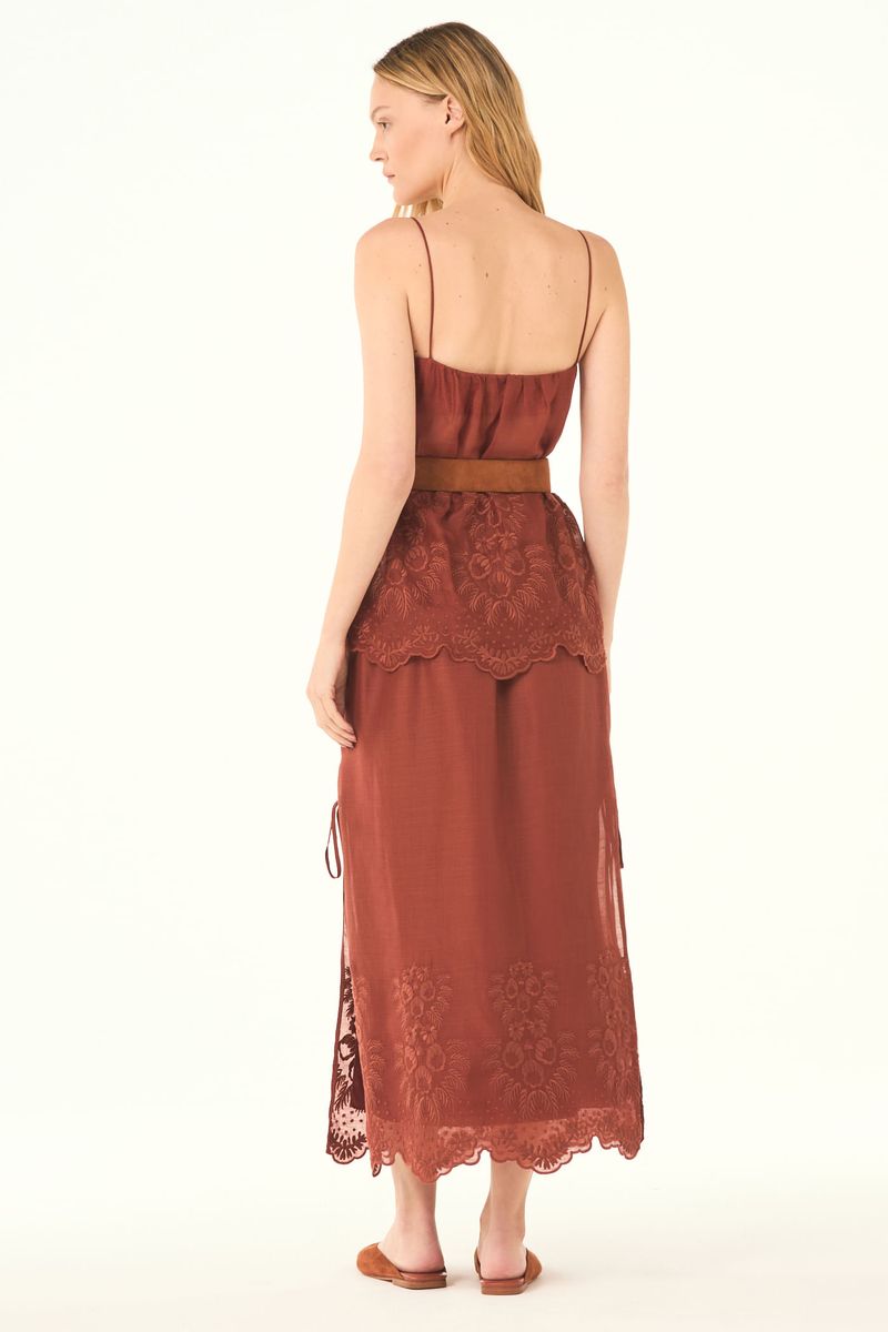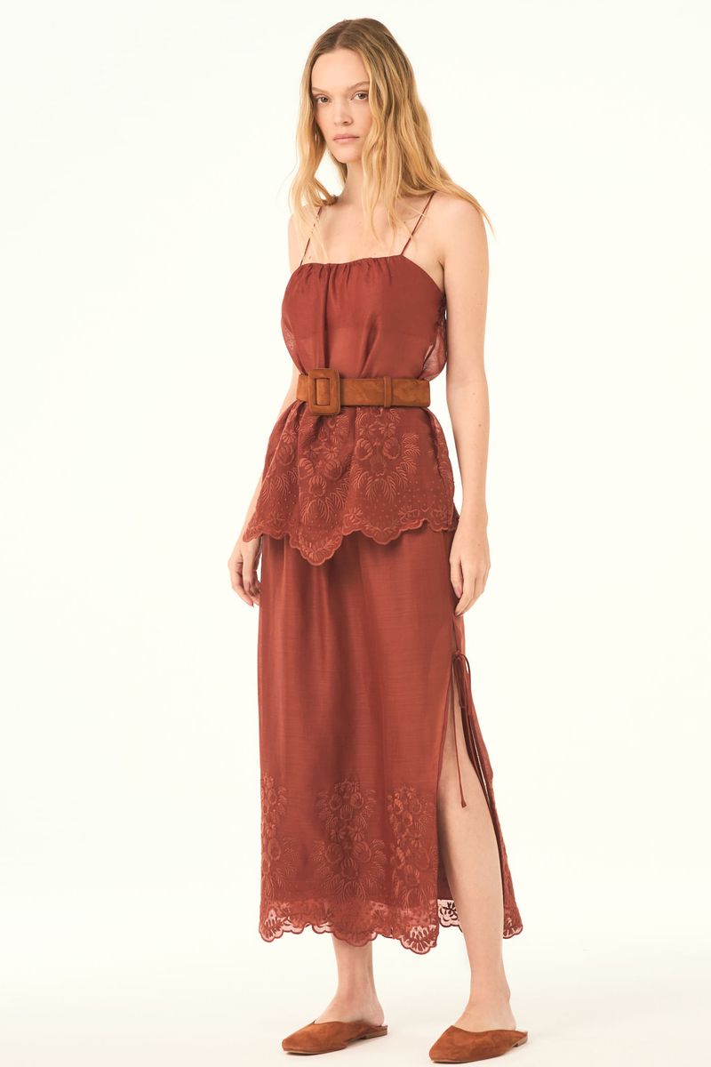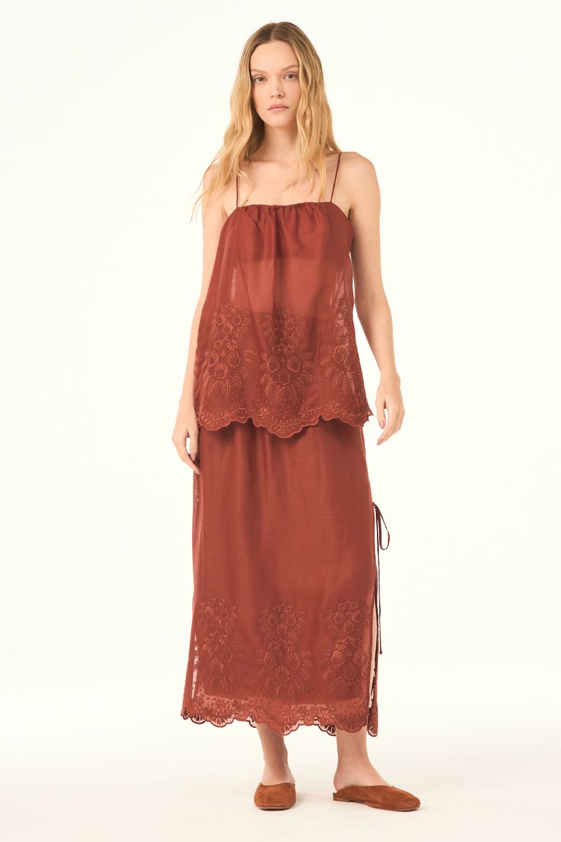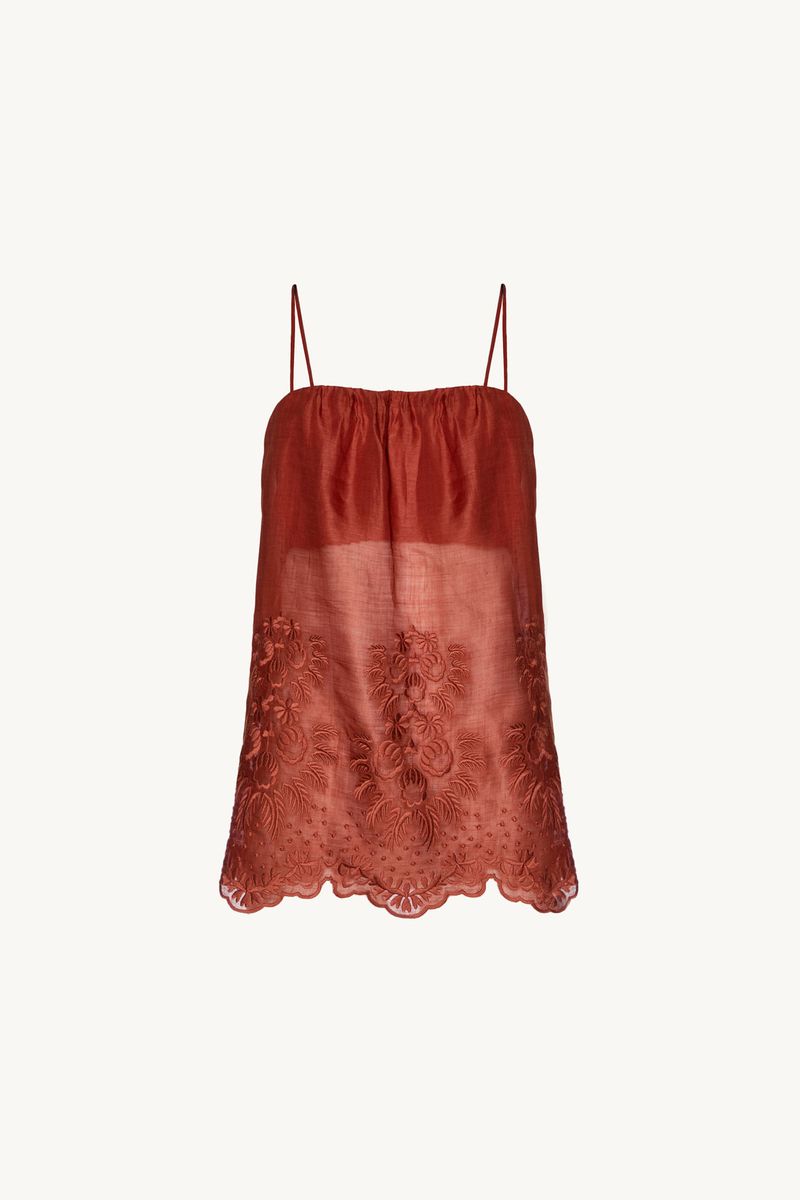 O top Polia CRIS BARROS é chique e feminino. De Maeve, tule de linho 100% com renda localizada delicadamente bordada, acabamento festonê e barrado cortado à laser. Possui shape evasê, alças finas e decote reto.