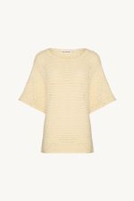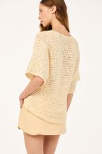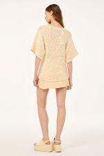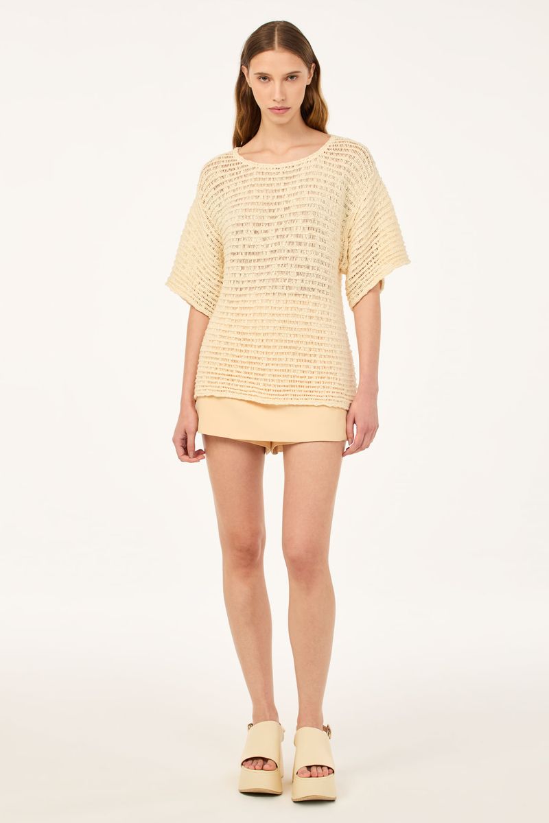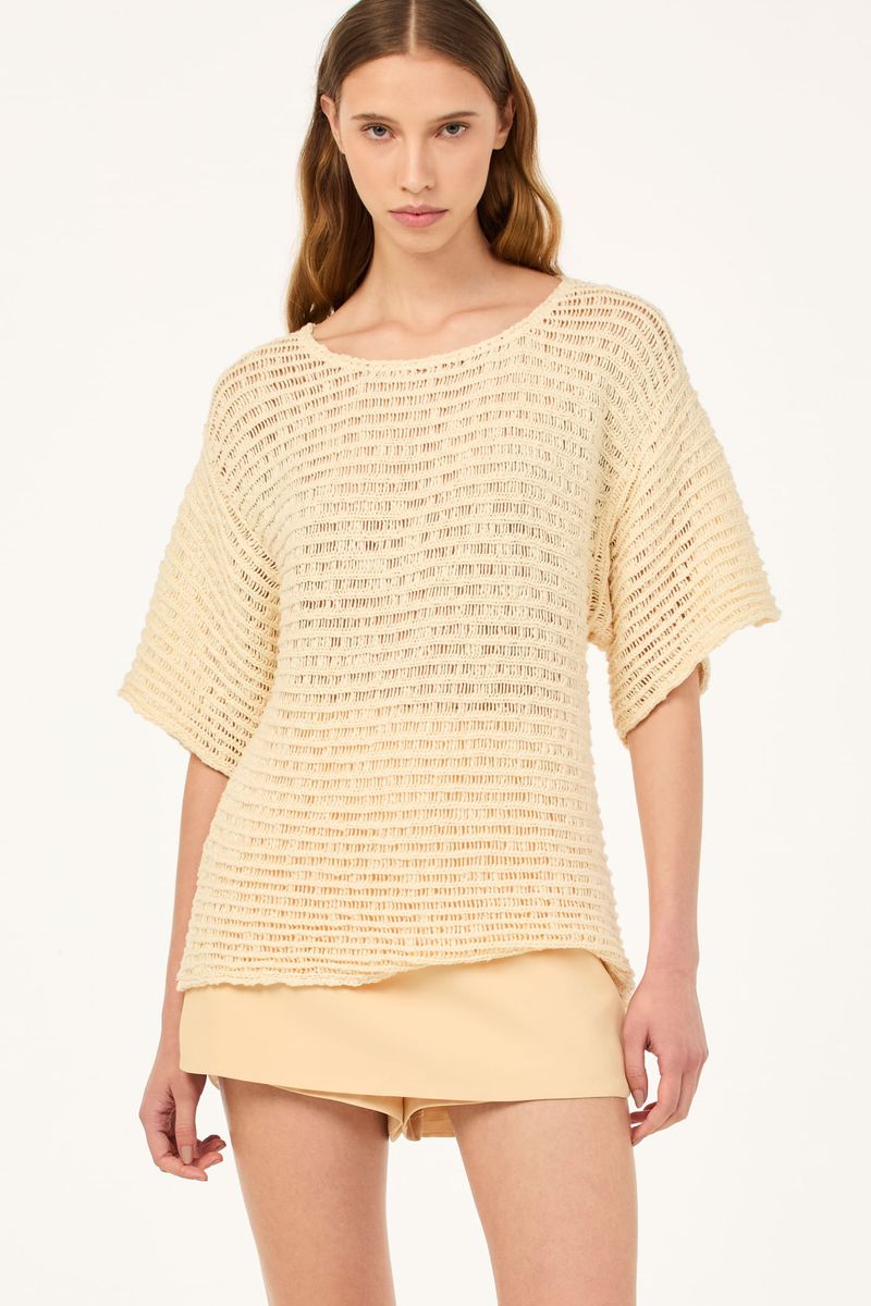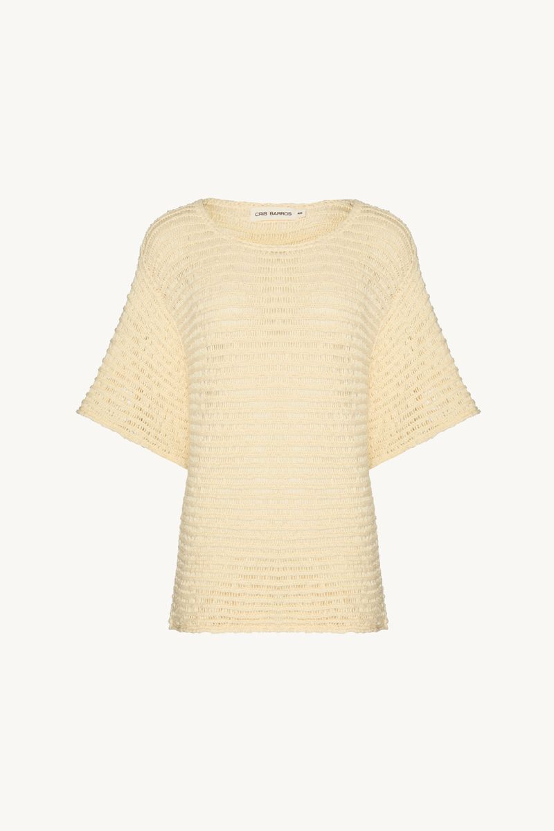 O top Rama CRIS BARROS é elegante e estiloso. De tricot, com ponto com leve transparência. Possui shape reto, decote careca e mangas curtas.