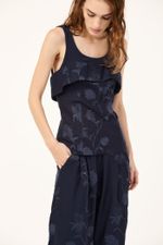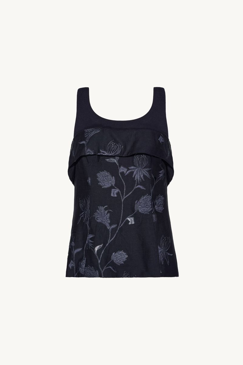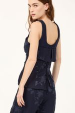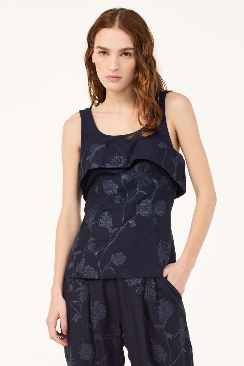 O top Ravena CRIS BARROS é moderno e elegante. De Ravena, linho bordado com ramalhetes de flores orgânicas envolvidas por fio de lurex brilhante. Possui shape corpete, sobreposição no busto, recortes, alças e decote U, de Marjorelle e amarração posterior por cordão.