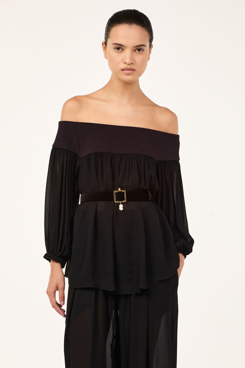 O top Rose CRIS BARROS é cool e fashionista. De Virgo, nossa viscose creponada, fluida e com leve transparência. Possui shape reto evasê, decote ombro a ombro com pala de Marjorelle e mangas longas levemente bufantes.