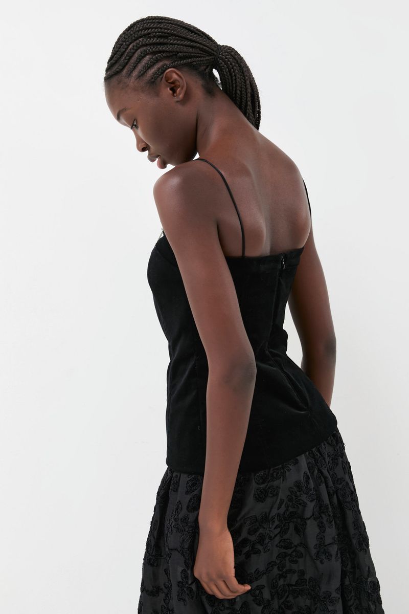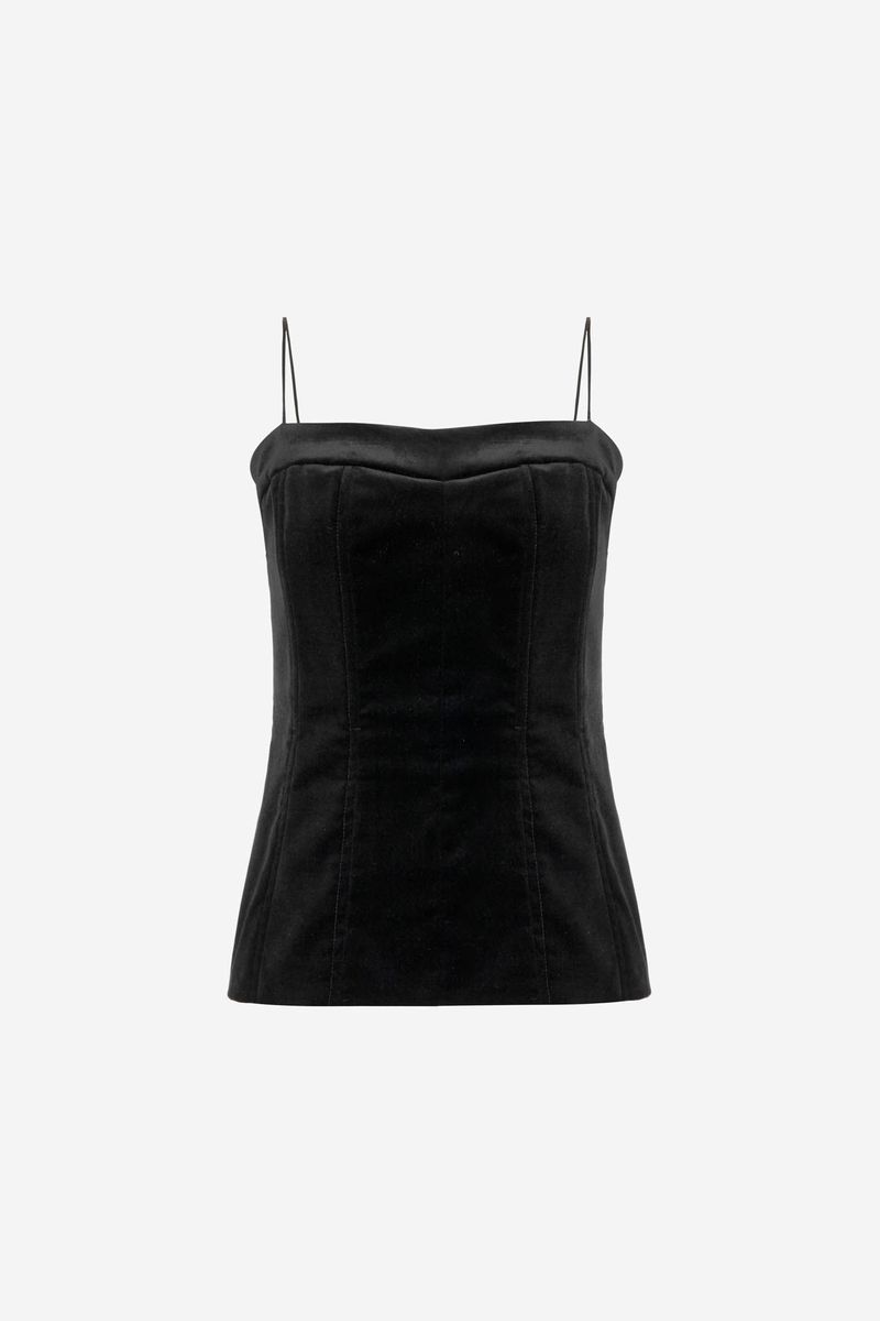 O top Ruby CRIS BARROS é atemporal e estiloso. De Karim, veludo de algodão com elastano e leve brilho. top de tecido veludo karim. Possui shape justo, estraturado com recortes ao longo do corpo, alças finas e fechamento por zíper lateral invisível. Dica de styling: Use sem alças.