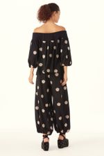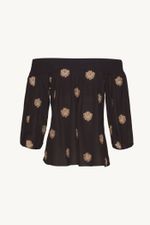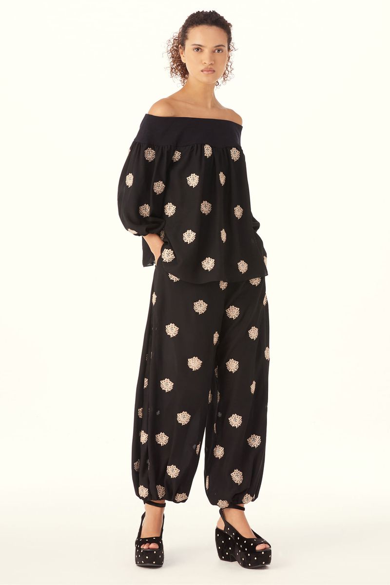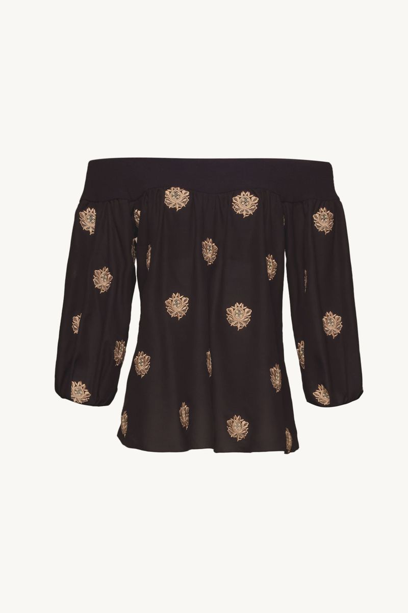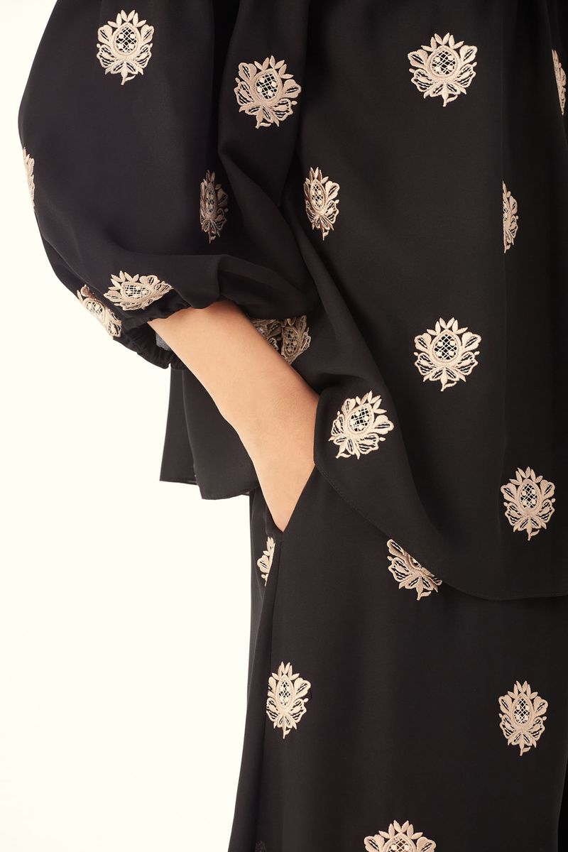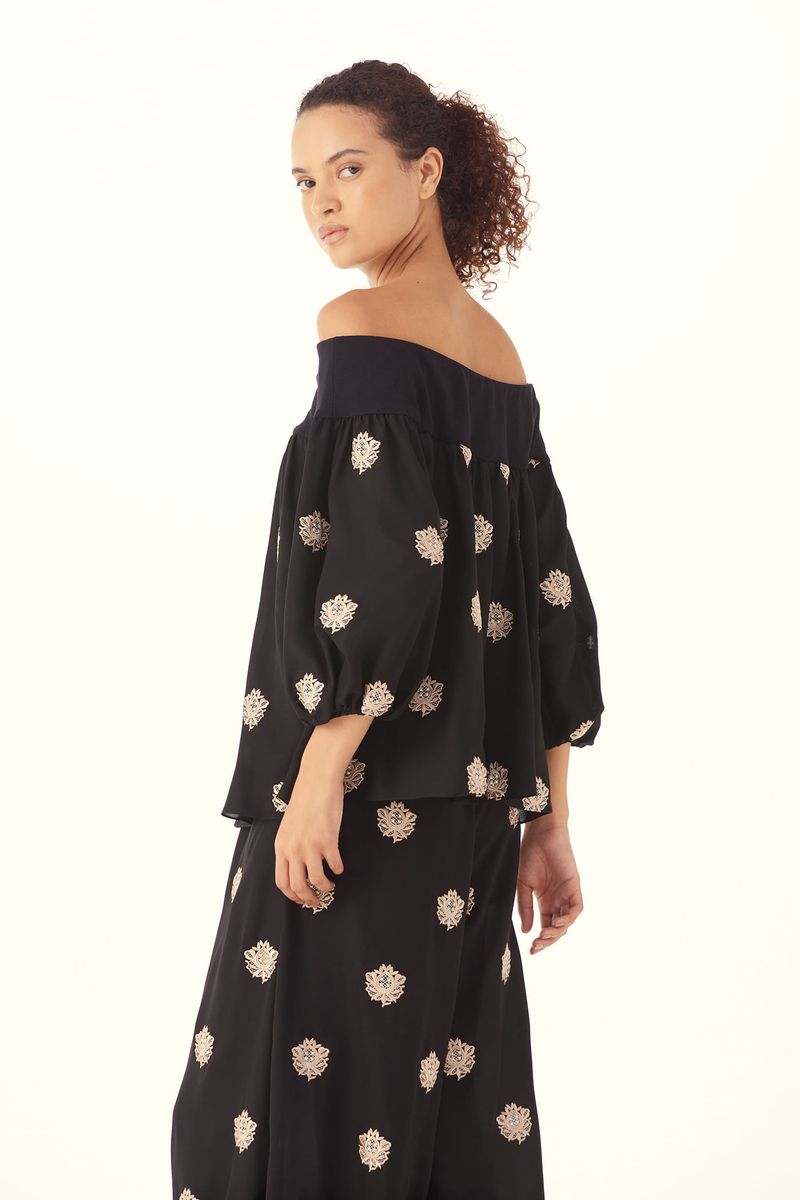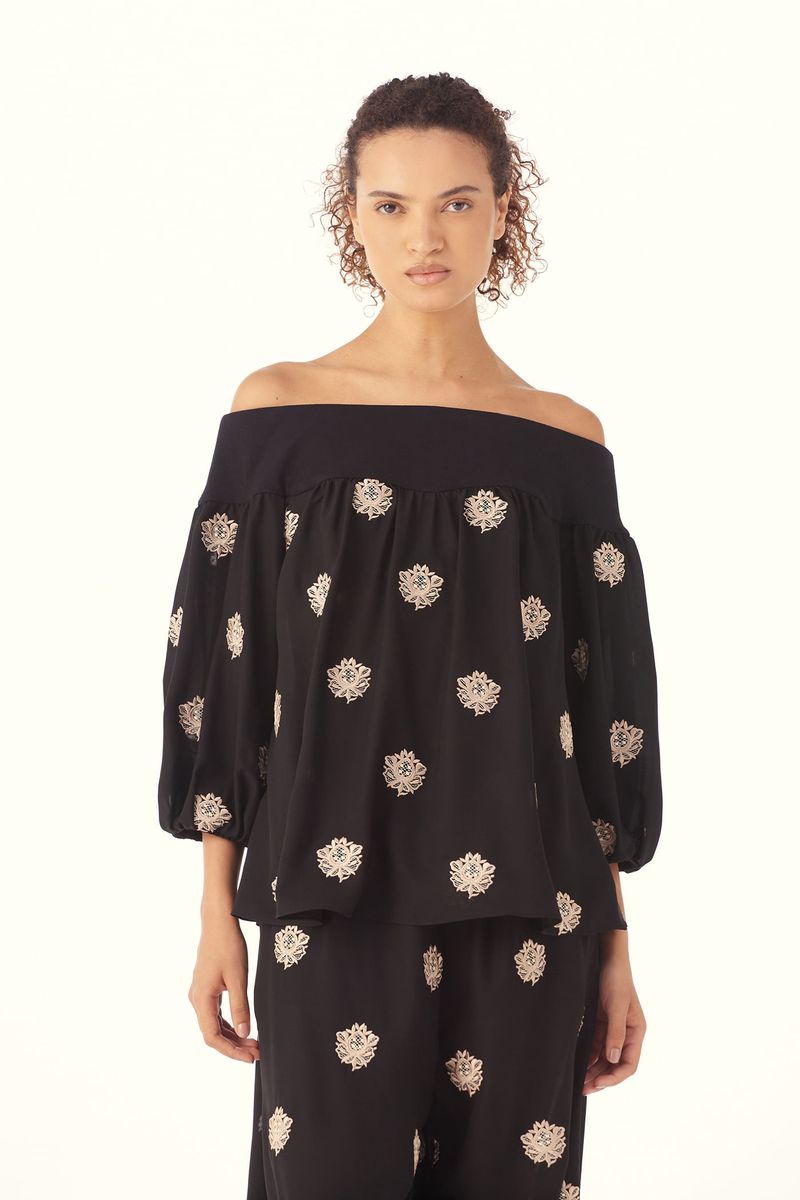 O Top Sandalo traduz uma feminilidade moderna, onde fluidez e presença se encontram com naturalidade. Confeccionado em Sandalo, Crepe de Chine mantém a inspiração provençal do buquê floral, reinterpretada com pequenos brasões, mantendo a técnica de recorte a laser e detalhes sutis de richelieu pontilhado, resultando em um desenho leve, elegante e de leitura atemporal, revelando movimento leve e toque suave. O decote ombro a ombro é construído com pala em Marjorelle, enquanto o corpo e as mangas longas em Sandalo definem um shape de caimento solto ao corpo, finalizando com uma assinatura precisa de CRIS BARROS.