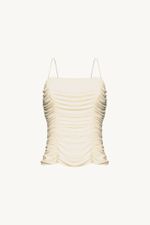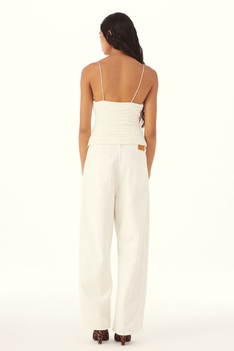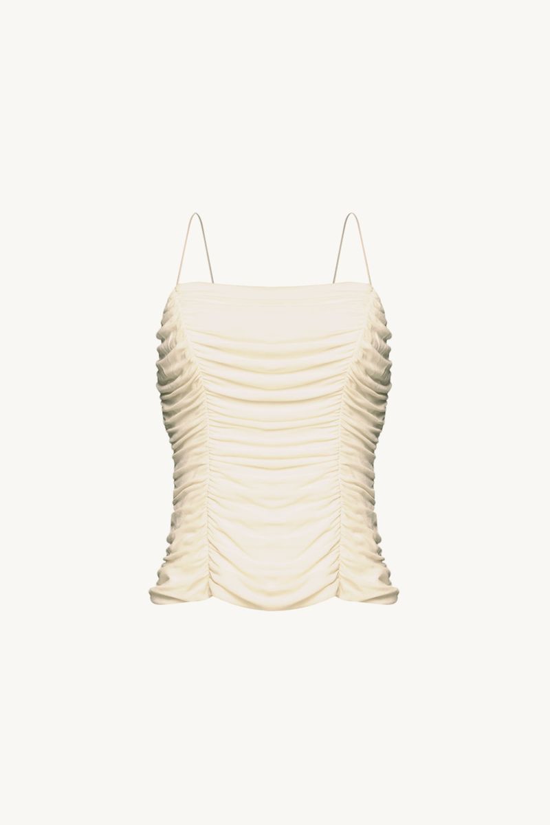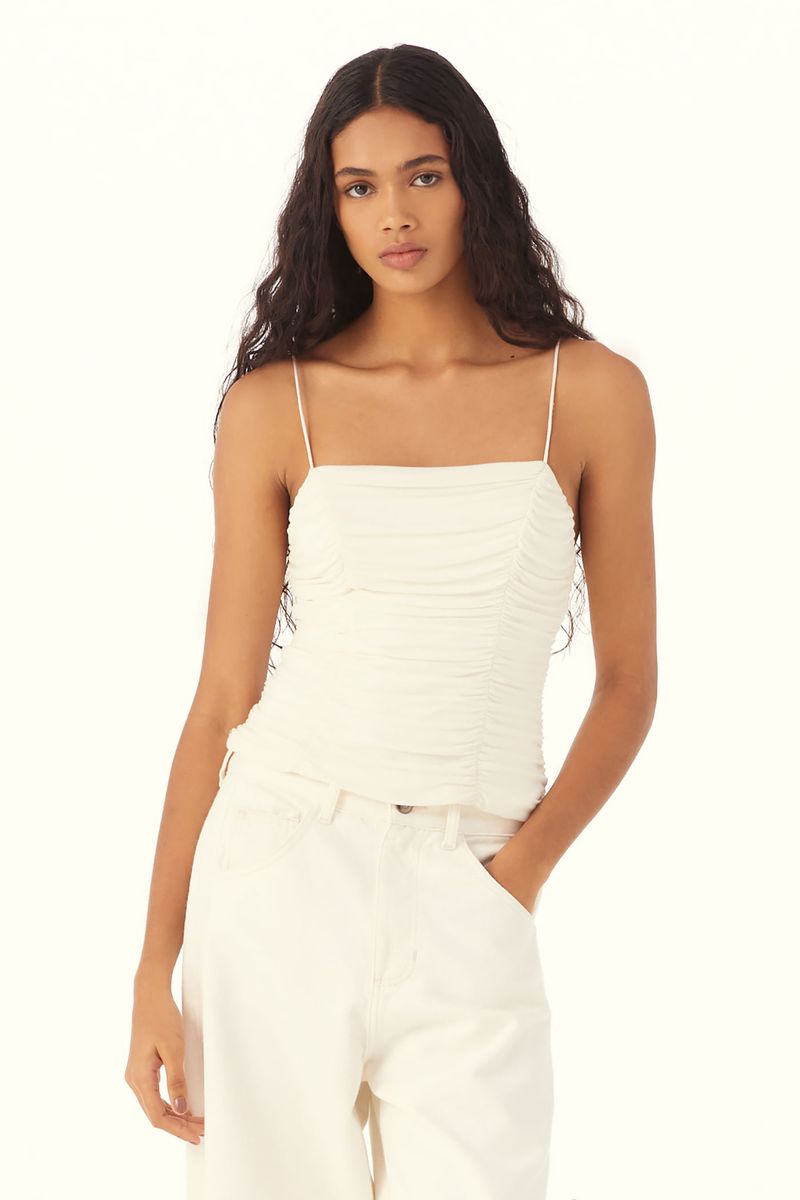 O Top Silvia traduz uma feminilidade contemporânea, onde textura e precisão se encontram em equilíbrio. Confeccionado em Odessa, malha de viscose ultra fina que proporciona conforto para o dia a dia, trabalhada em plissado remetendo os ambientes teatrais italianos, revela toque macio e elasticidade que acompanha o corpo. A modelagem ajustada ganha franzidos que desenham a superfície com movimento, enquanto o decote reto e as alças em cordão acetinado refinam o traço, combinados ao zíper lateral discreto e ao comprimento cropped que arremata a peça com linhas limpas e modernas.