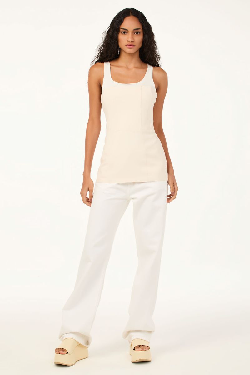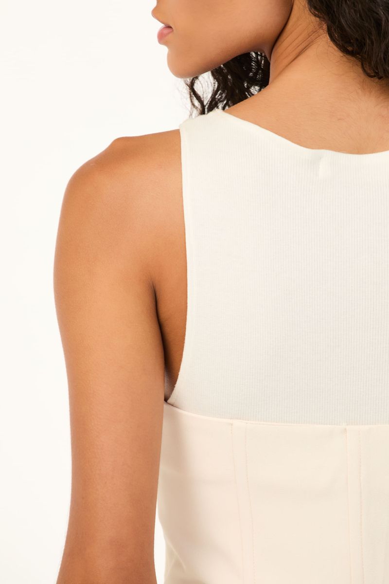O top Suzanna CRIS BARROS é moderno e estiloso. De Avalon, nosso tecido clássico, encorpado e fluido, perfeito para alfaiataria e que possui certificação FSC, com maior responsabilidade ambiental, suas fibras são feitas a partir do manejo sustentável de áreas reflorestadas. Possui shape corpete, sobreposição com Rib, alças largas, decote U e comprimento alongado.