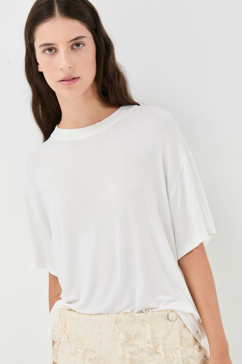 O top Tonga CRIS BARROS é um básico indispensável. De Odessa, nossa malha de viscose ultra fina, super confortavél para o dia a dia. Possui shape t-shirt ampla, decote careca com acabamento de punho e mangas curtas.