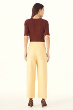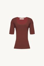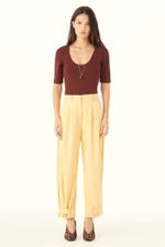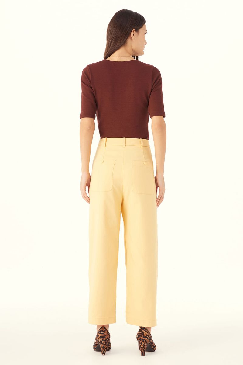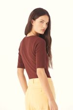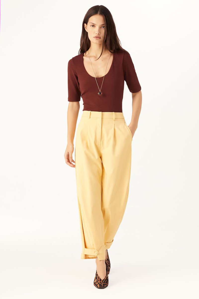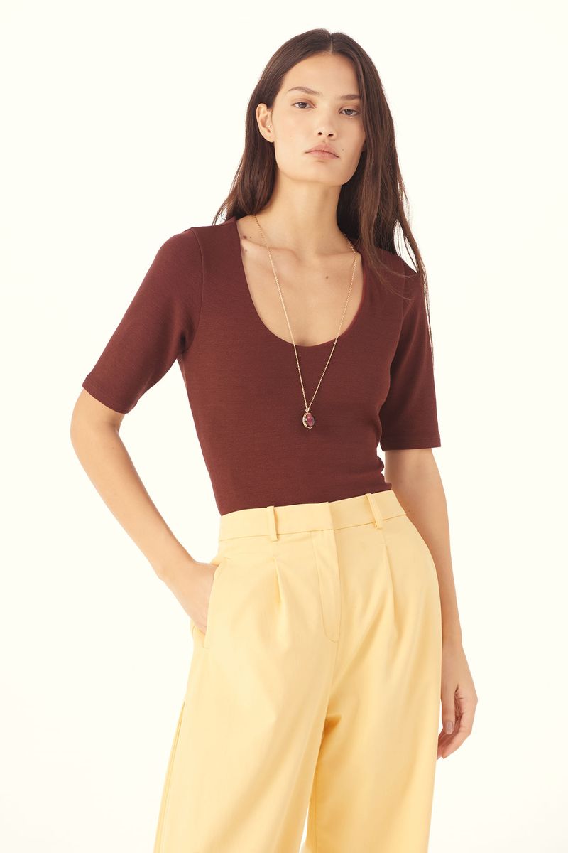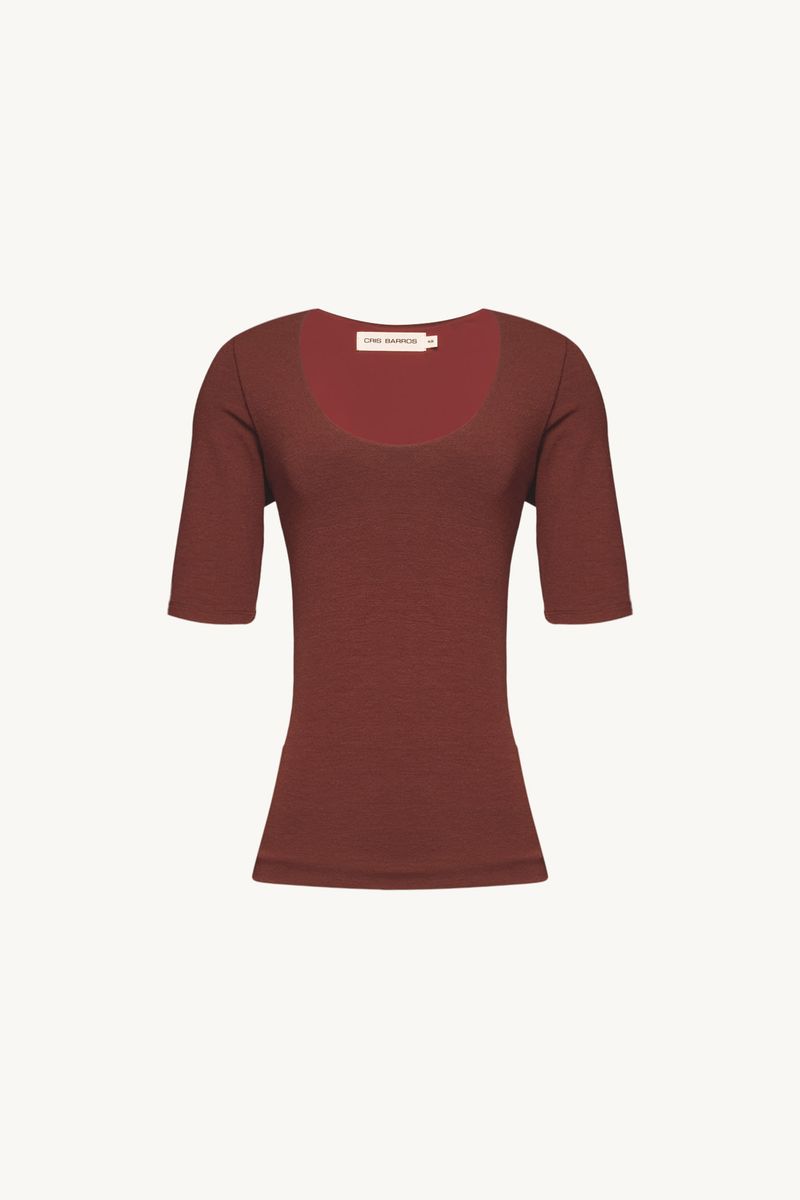 O Top Vicino traduz uma abordagem minimalista, onde precisão de linhas e conforto se encontram. Confeccionado em Marjorelle, tecido feito em viscose LENZING™ECOVERO™, fibra renovável desenvolvida com madeira certificada e produzida com cerca de menos emissões de CO2 e consumo de água em relação à viscose tradicional, revela toque macio com elasticidade sutil. A modelagem ajustada ao corpo com mangas curtas e decote redondo amplo é arrematada por costuras limpas e barra reta, com etiqueta discreta na nuca que pontua a assinatura CRIS BARROS em equilíbrio entre o simples e o sofisticado.