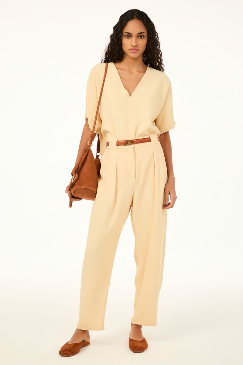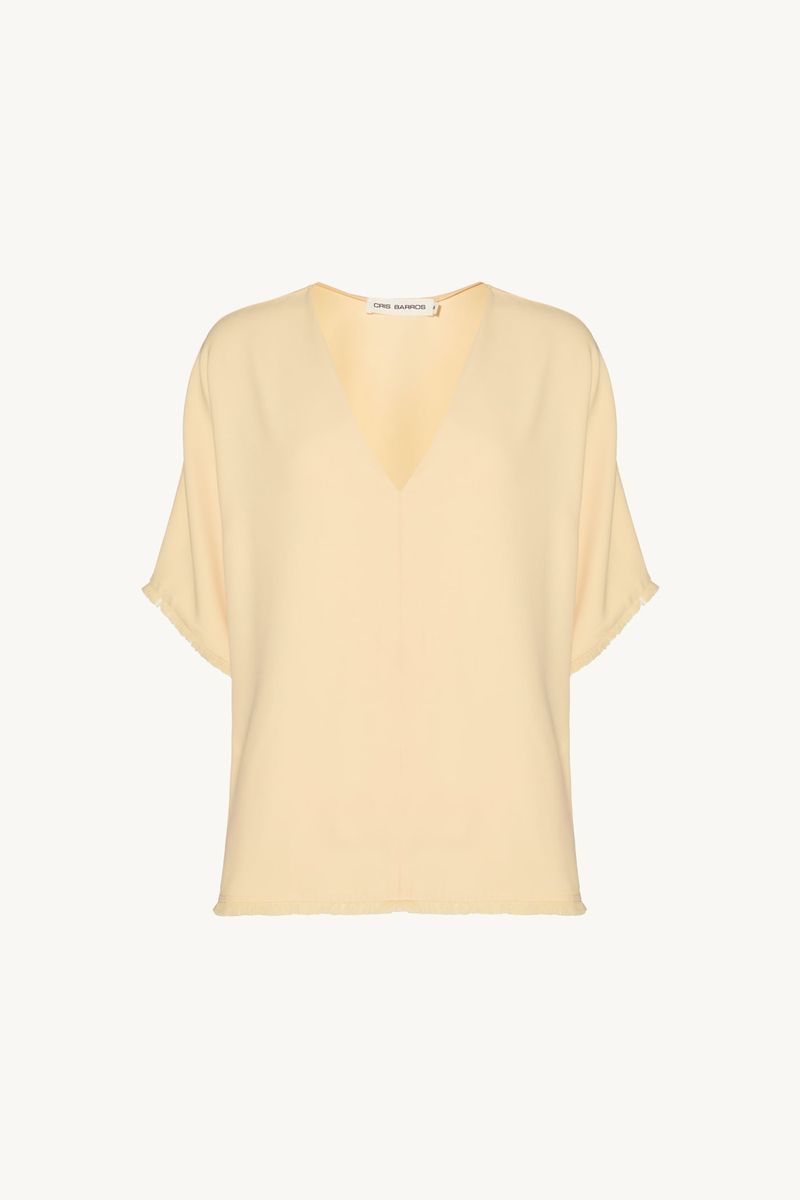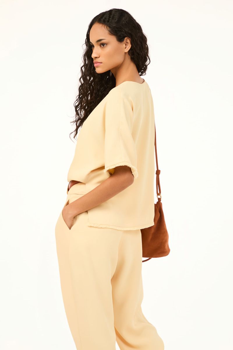 O top Viola CRIS BARROS é fresh e estiloso. De Avalon, nosso tecido clássico, encorpado e fluido, perfeito para alfaiataria e que possui certificação FSC, com maior responsabilidade ambiental, suas fibras são feitas a partir do manejo sustentável de áreas reflorestadas. Possui shape reto, mangas curtas, decote V com detalhe de aplicação peluciada na boca das mangas e na barra.