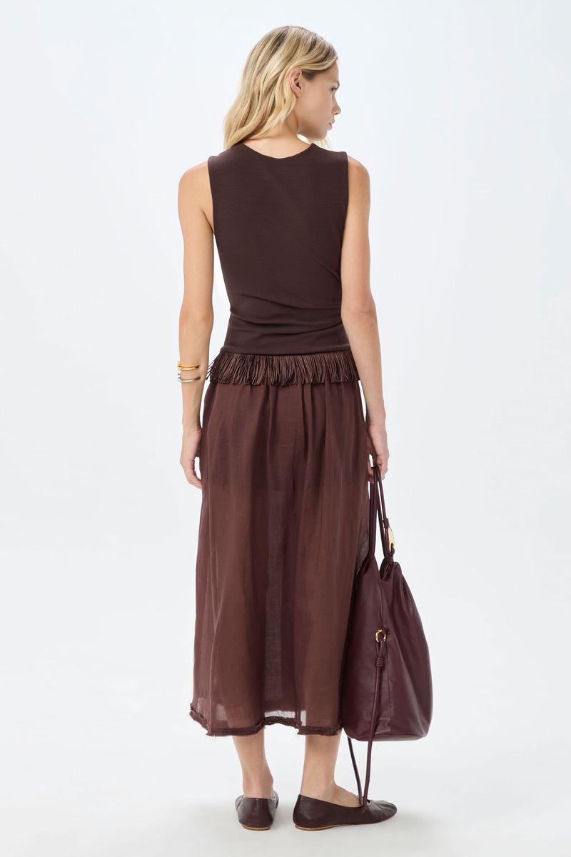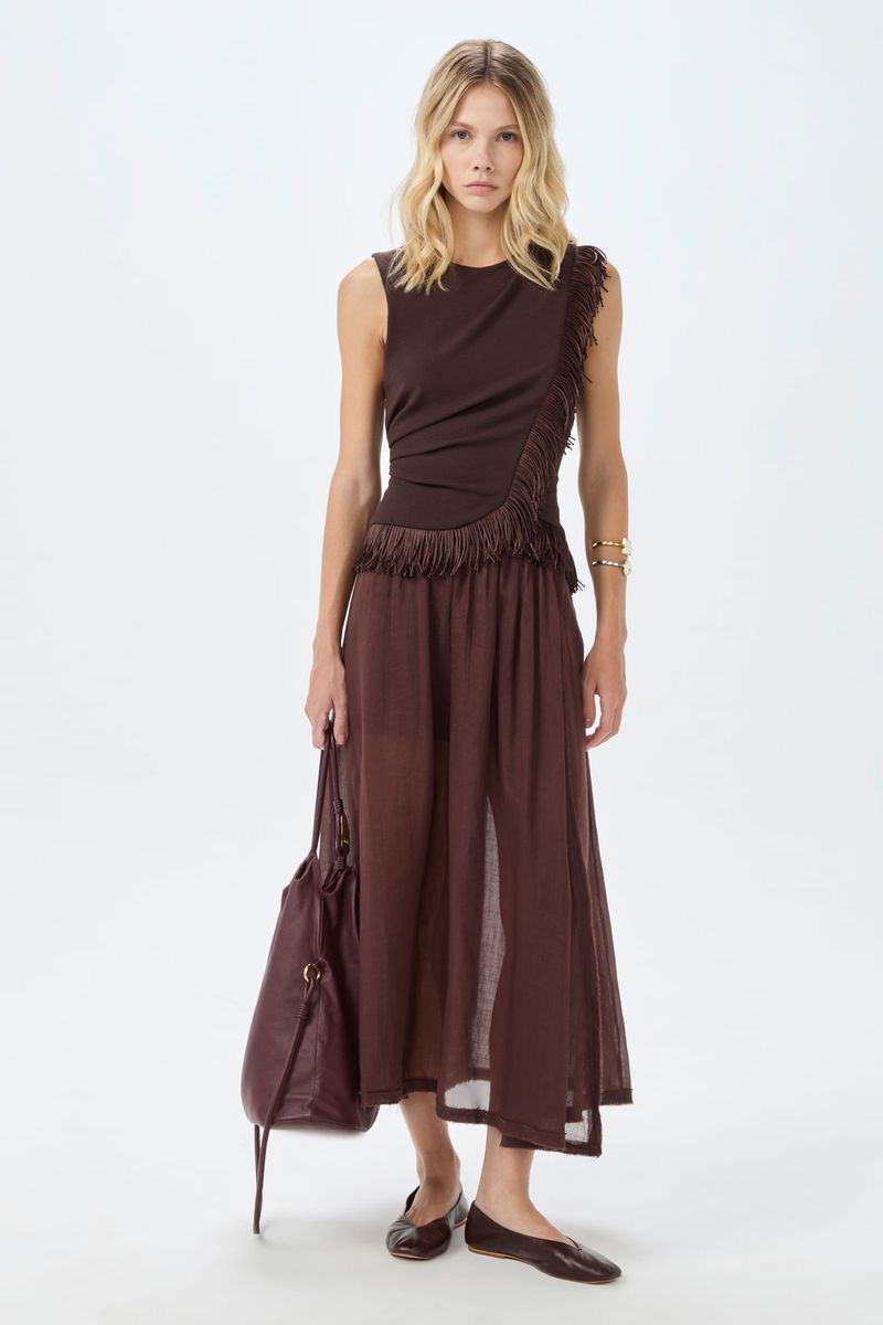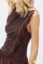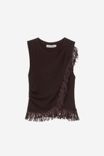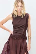 O top Yelda CRIS BARROS é elegante e estiloso. De Marjorelle, nossa clássica malha creponada de toque macio que garante muito conforto e sofisticação, feito com fibra de origem natural que possui a certificação LENZING ECOVERO garantindo uma produção com baixos impactos ambientais. Possui shape justo e transpassado, decote careta, franzido na lateral da cintura e do ombro, detalhe com aplicação de franjas no meio e ao longo da barra e fechamento por zíper invisivel lateral.