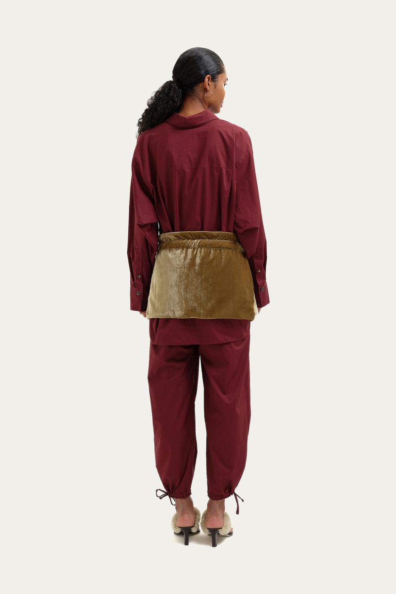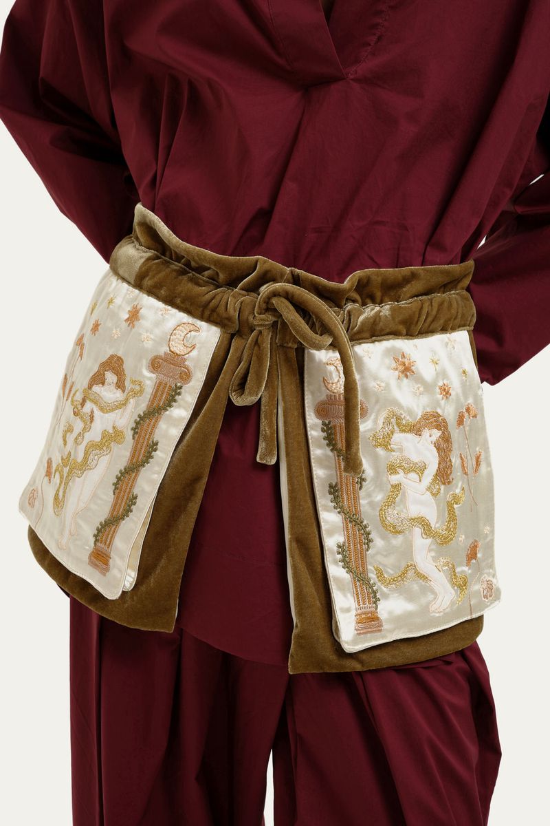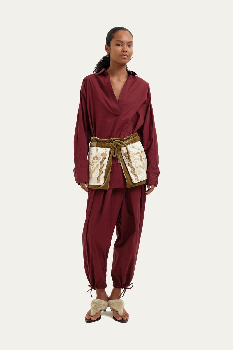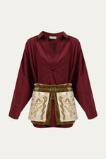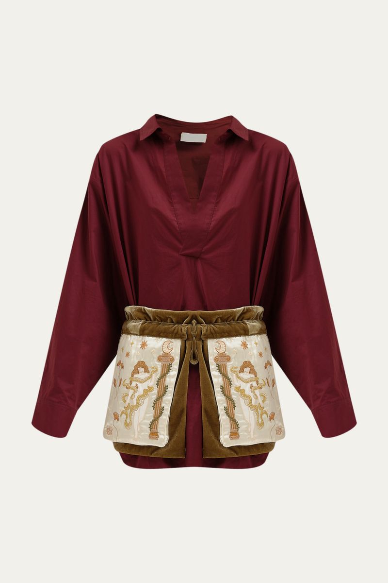 A Túnica Gami Framed, confeccionada em algodão de tecido plano, apresenta um design que equilibra sofisticação e conforto. Detalhes como o decote em V com gola colarinho, fendas laterais e mangas compridas com punhos ajustados delineiam sua silhueta. O toque distintivo reside na pala removível em veludo, adornada com bolsos bordados em cetim, que eleva a peça a um patamar de exclusividade e arte.