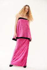 Vestido longo em veludo texturizado. Modelagem reta. Tomara-que-caia. Decote reto. Fenda posterior. Acabamento em veludo de cor contrastante. Fechamento posterior em zíper invisível.