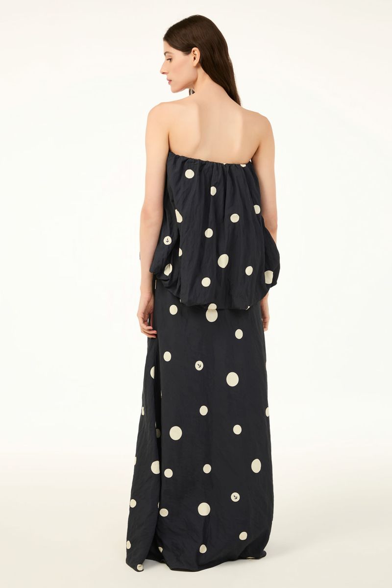 O vestido Aurora longo CRIS BARROS é cool e fashionista. De Marshmallow, viscose proveniente de manejo florestal sustentável com certificação FSC e tratada com produtos certificados OEKO-TEX , inofensivos para as pessoas e o meio ambiente, traz a estampa corrida exclusiva Dots, desenvolvida em nosso atelier. Possui shape sem alças, caimento sobreposto balonê no top e saia sereia longa.