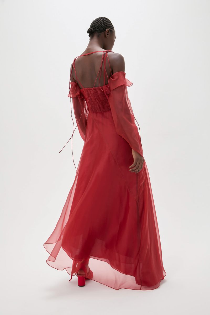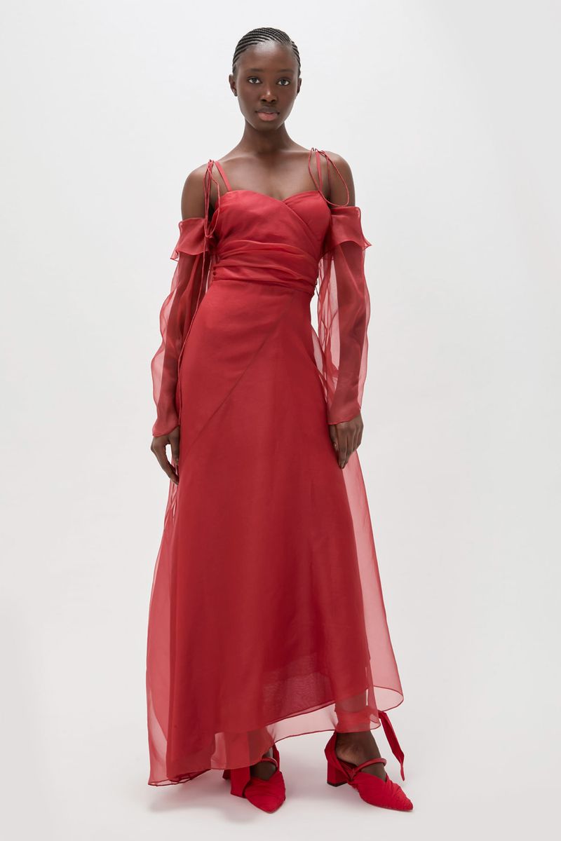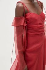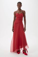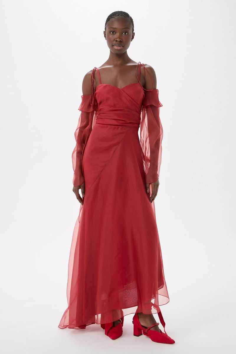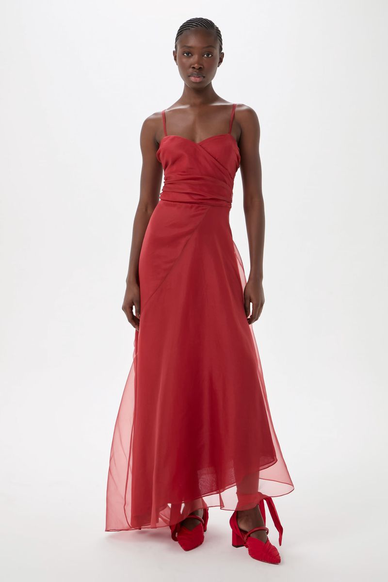 O vestido Basilica longo CRIS BARROS é romântico e elegante. De organza. Possui decote coração transpassado, cintura marcada drapeada, alças finas, saia longa evasê assimétrica com recorte diagonal. Acompanha luvas removíveis. Cor:ARDENTE