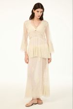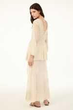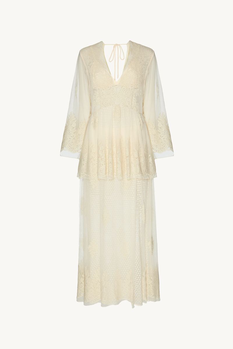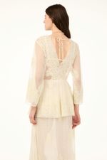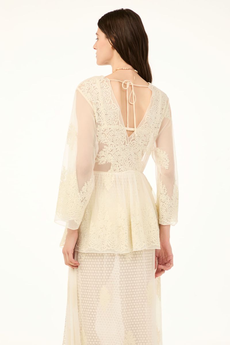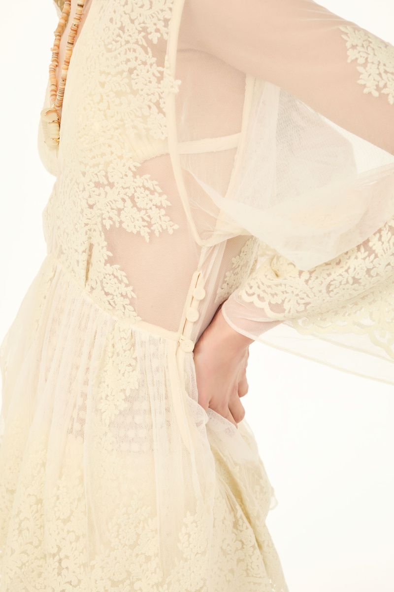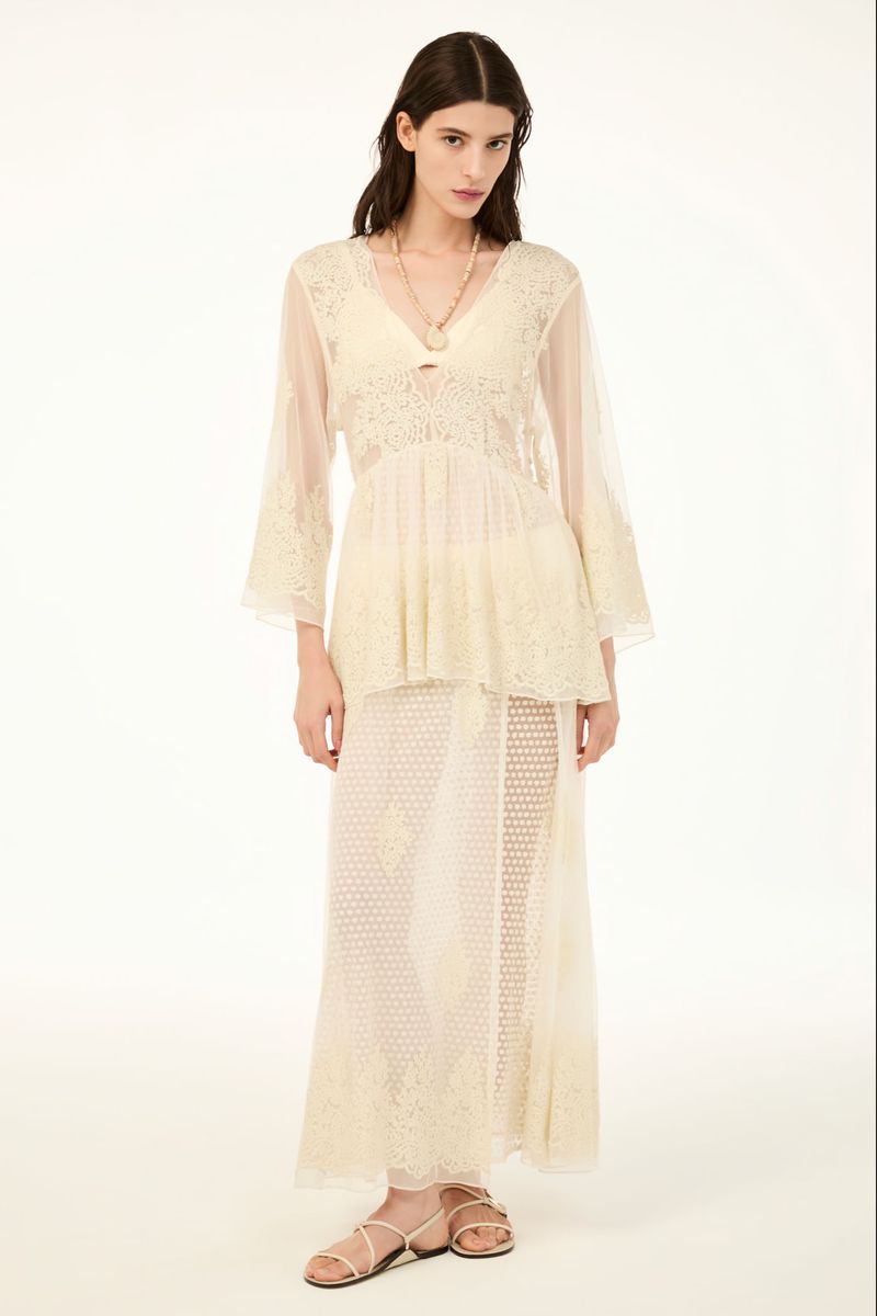 O vestido Brigitte CRIS BARROS é romântico e delicado. De Brigitte, tule fluido, de renda delicadamente bordada com acabamento festonê e barrado cortado a laser. Possui shape amplo, decote V, mangas 7/8, saia sobreposta mais curta, saia longuete evasê e fenda frontal. Acompanha sutiã e hot pants.