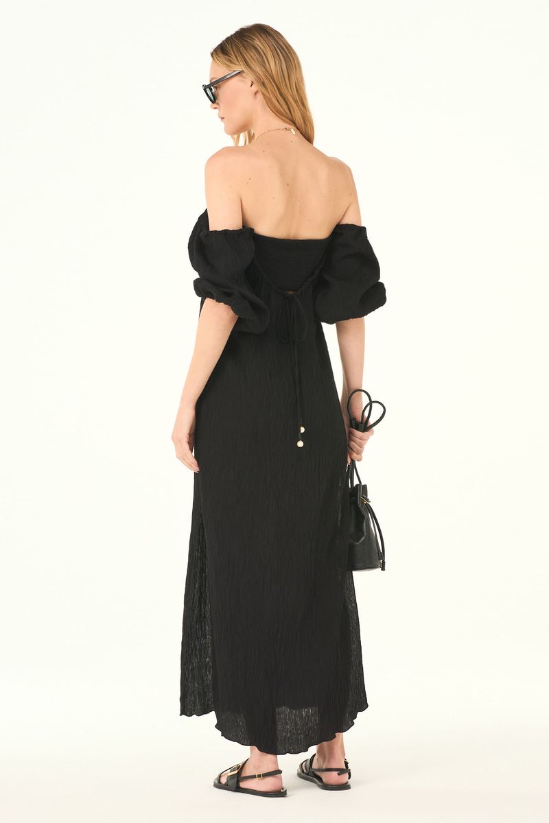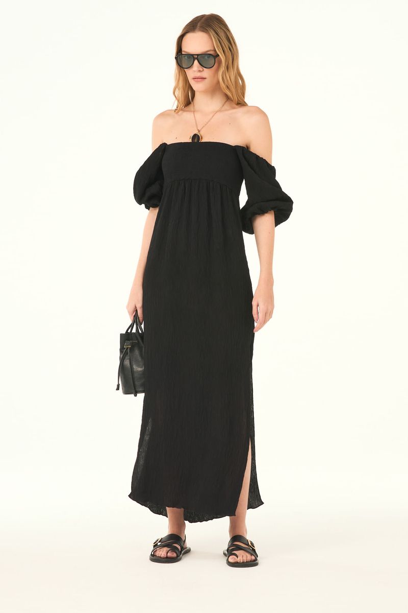 O vestido Calanta CRIS BARROS é chique e estiloso. De Tunisia, tecido misto com toque leve, brilho e caimento perfeito. Possui shape solto, decote ombro a ombro com mangas curtas bufantes, busto de lastex e rolote para regulagem.