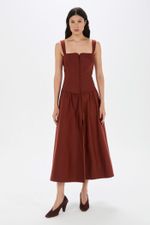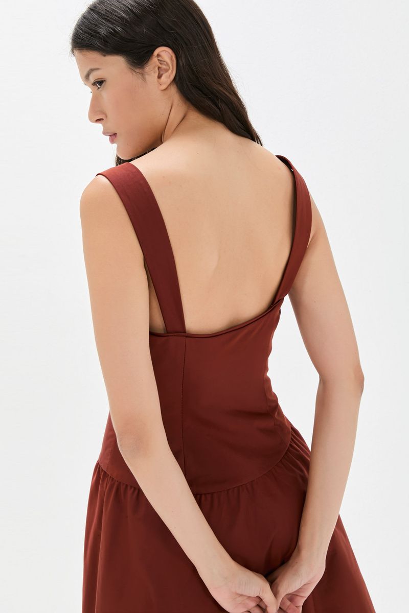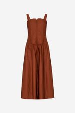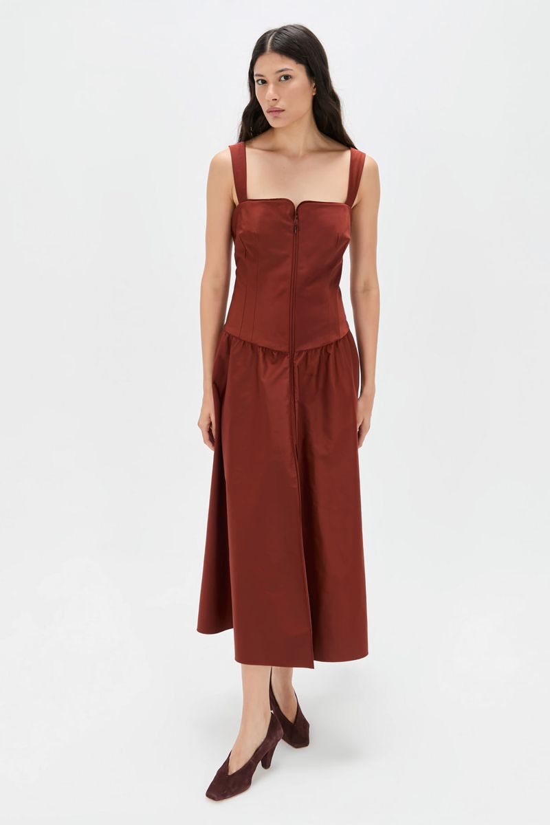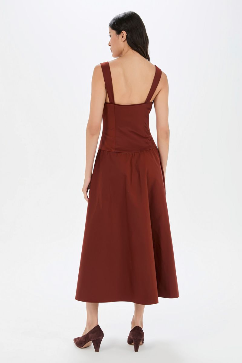 O vestido Charlotte CRIS BARROS é feminino com ares vintage. De Lina, tecido misto de algodão, leve e sarjado com caimento preciso e único. Possui top corsete, com fechamento por zíper no centro frente do decote, alças largas, saia midi levemente rodada e fenda frontal.
