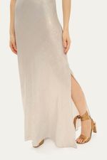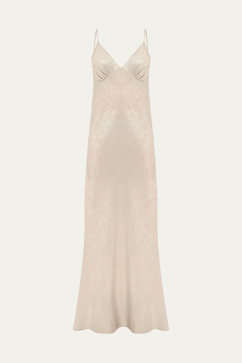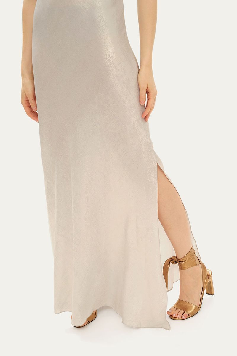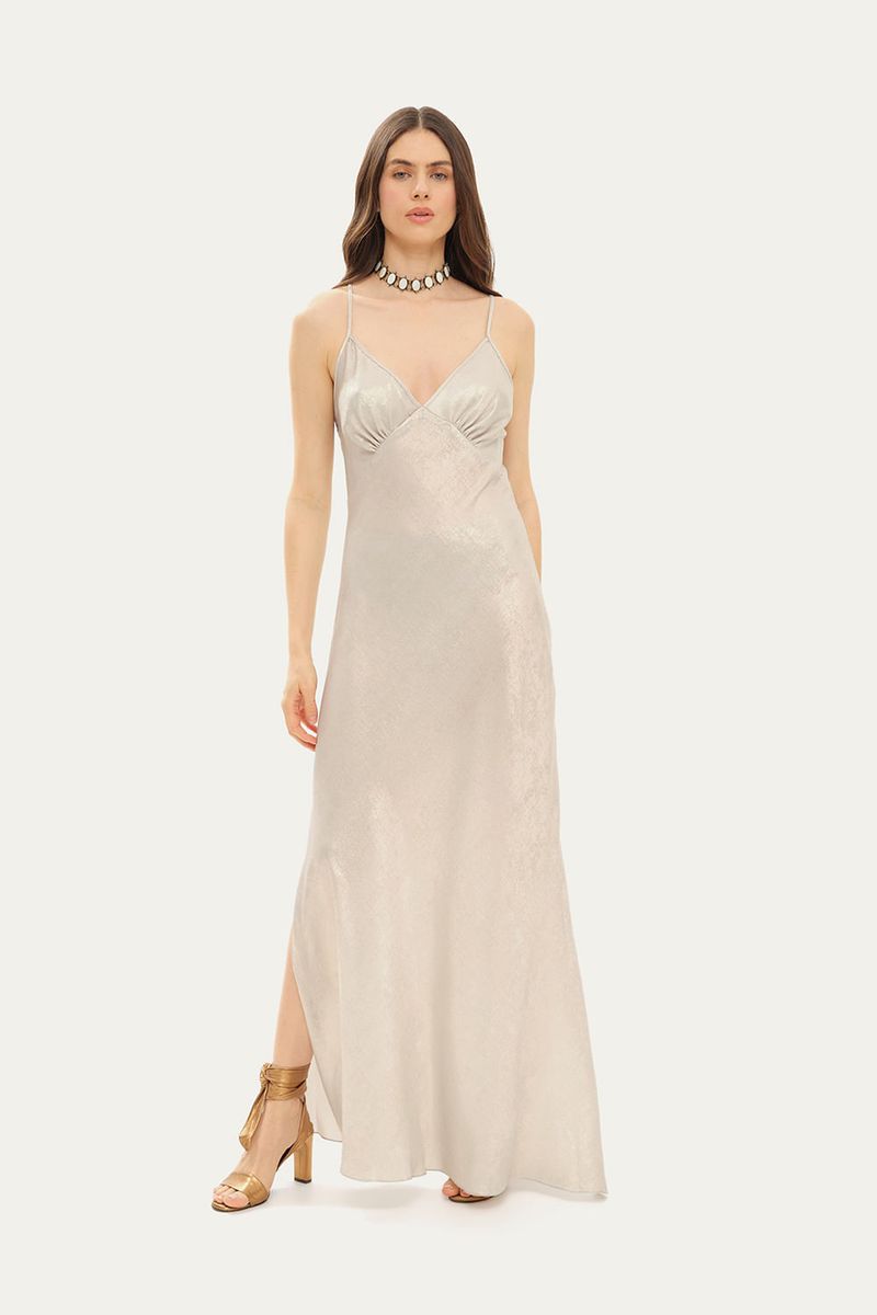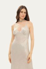 O Vestido Clara em cetim prateado é uma peça deslumbrante que combina sofisticação e caimento impecável. Com seu decote V elegante e alças finas, o busto apresenta recortes e franzidos estrategicamente pensados para um encaixe perfeito.