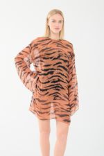 Vestido curto em seda. Modelagem reta. Gola careca. Mangas longas amplas. Peça com transparência. Estampa animal print. Fechamento posterior em botão de aselha.