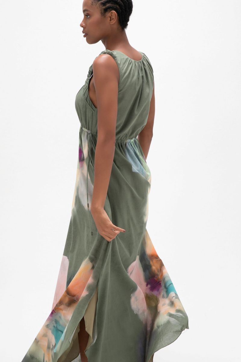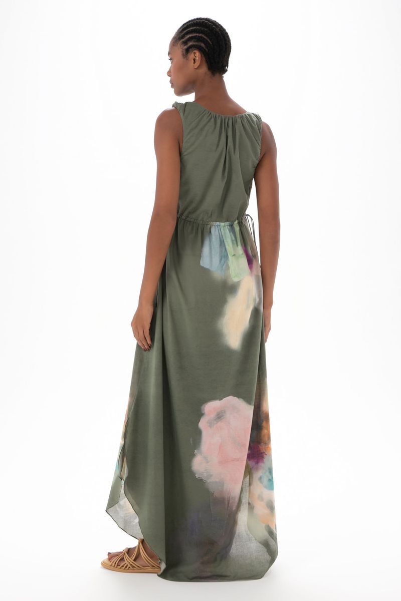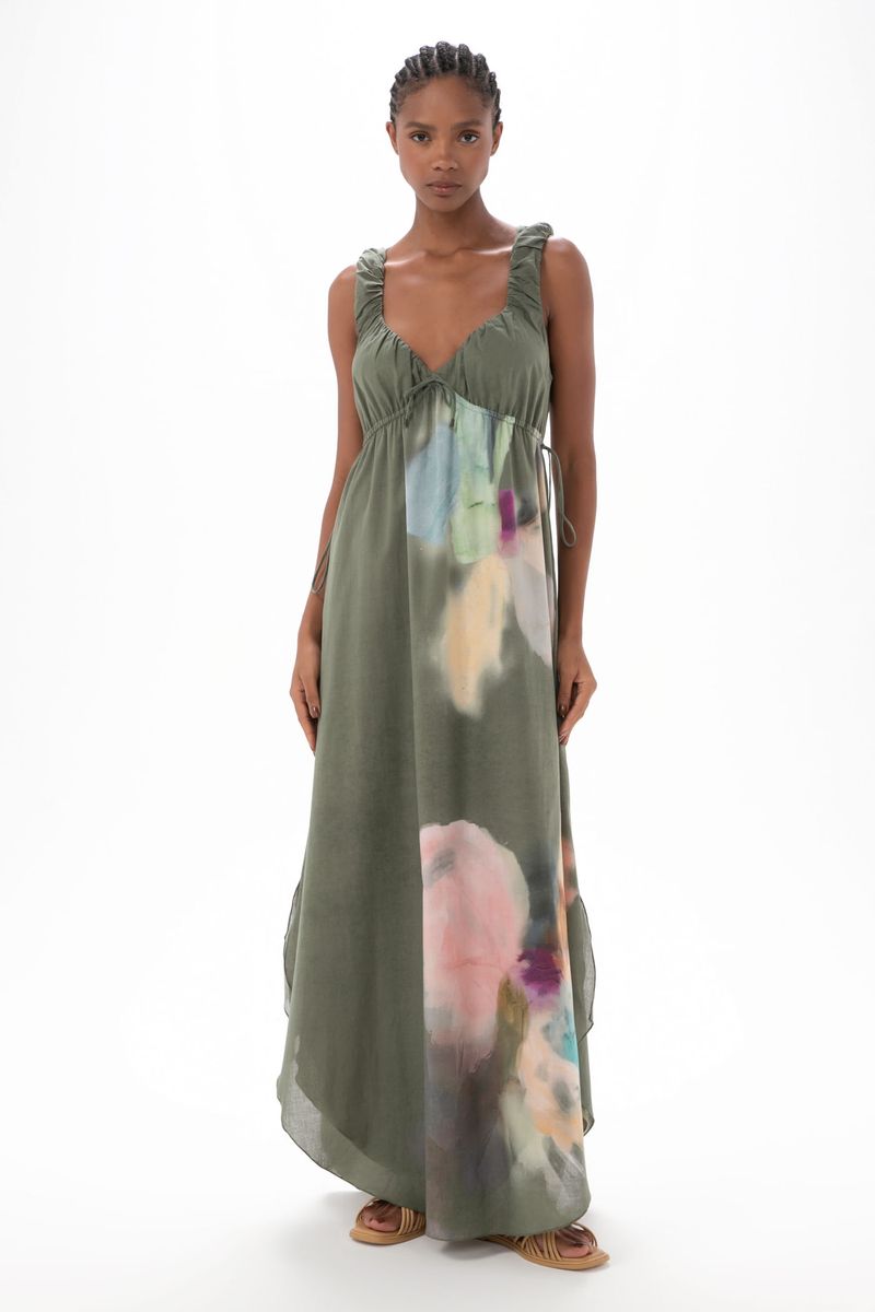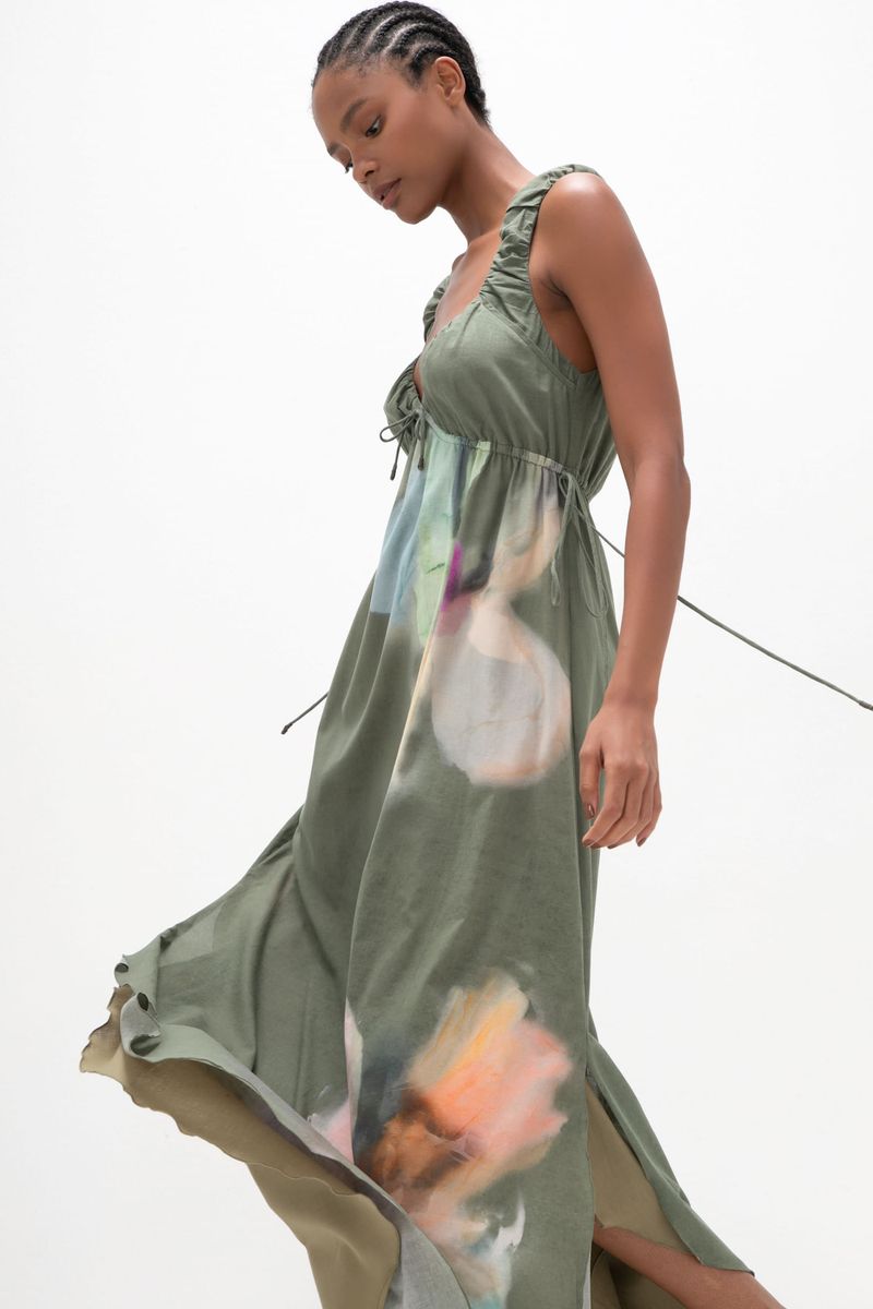 O vestido Daphne CRIS BARROS é cool e retrô. De Bartô, algodão 100%, possui fibra natural e biodegradável, tratada com produtos certificados OEKO-TEX , inofensivos para as pessoas e o meio ambiente.vestido em tecido barto. Possui decote princesa com amaração, alças grossas franzidas, recorte abaixo do busto com rolotes de amarração lateral, fendas laterais e comprimento longuete.