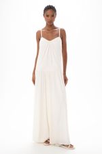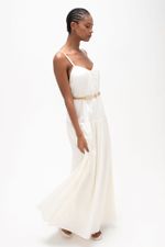 O vestido Franciele CRIS BARROS é easy chic. De Eugênia, tecido com caimento leve e fluido, feito fibra de origem renovável que possui a certificação TENCEL MODAL, garantindo manejo florestal sustentável e uma produção ecoeficiente. Possui shape solto alças finas, decote V com detalhe franzido no centro, recorte no quadril, decote posterior profundo com sutiã acoplado aparente com detalhe de aviamento jóia, de resina e banhado à ouro, ajuste posterior por rolote de amarração e comprimento longo rasteira.